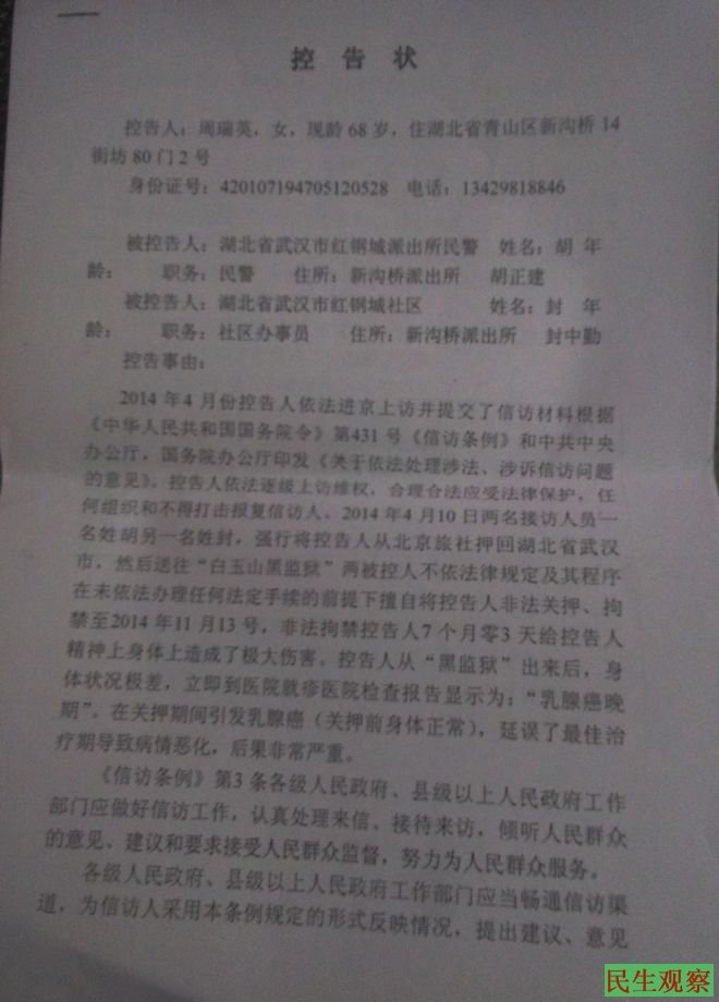 民生观察工作室2015/12/31消息:周瑞英是湖北省武汉市青山区新沟桥14街坊80门2吨的居民,武汉钢铁公司退休职工。近日,周瑞英找到本工作室投诉了她为儿上访长期被关黑监狱的情况。