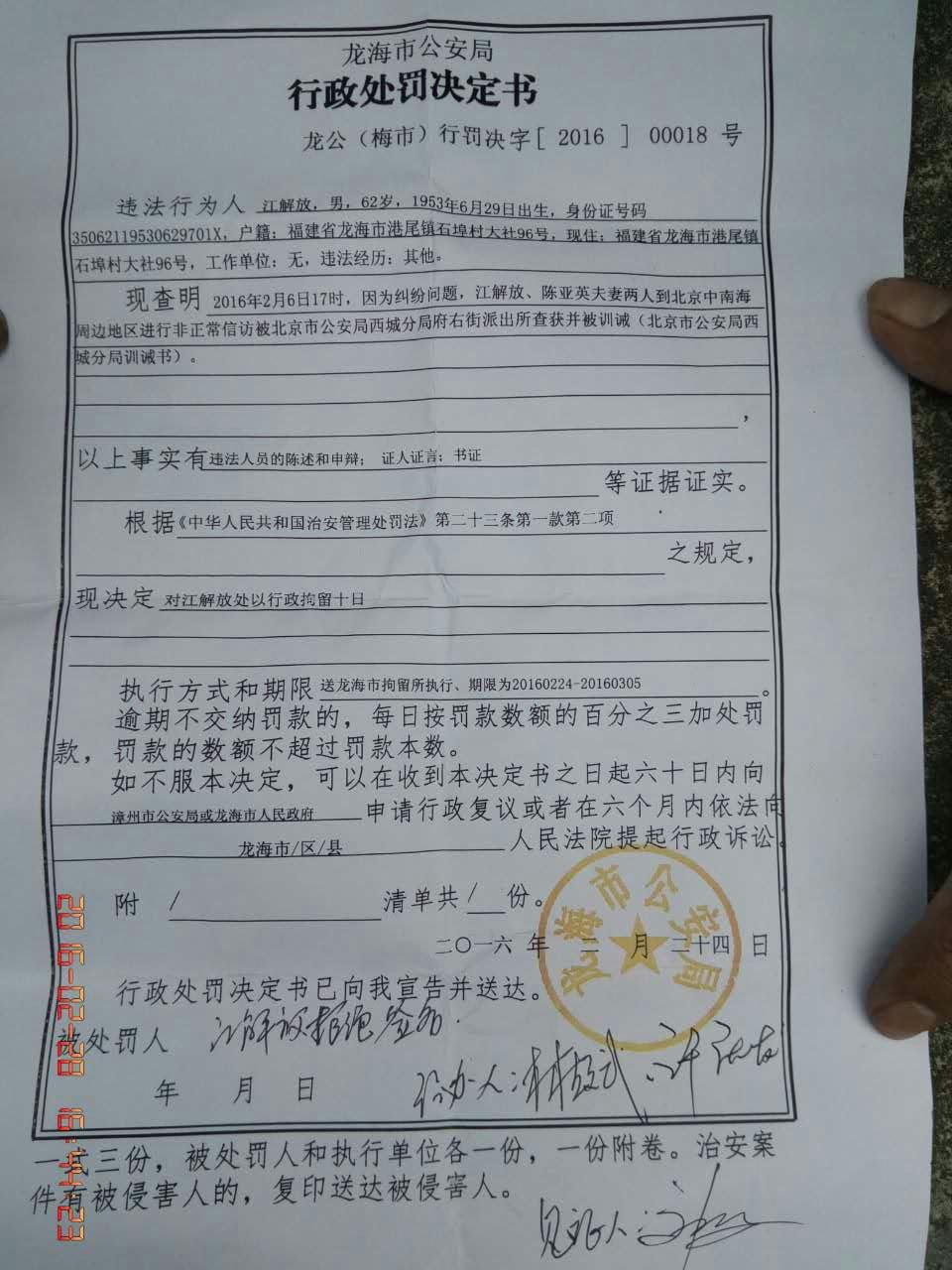 民生观察工作室2016/3/1消息:福建省龙海市访民江聪辉、和陈亚英、江解放夫妻于2月6日到中南海上访,24日被龙海市公安局将其各自拘留10天,现关押在龙海市拘留所。