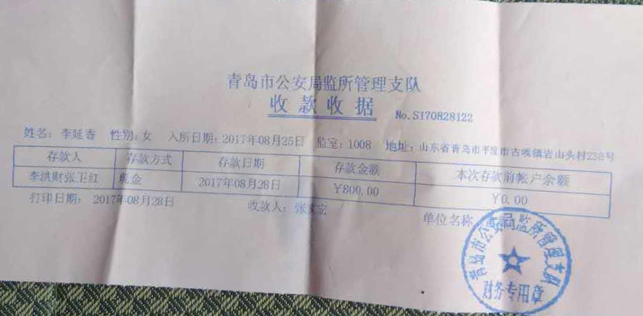 【民生观察2017年8月28日消息】本网从张皖菏处获悉,山东青岛维权人士李延香近日被警方以“寻衅滋事罪”从行拘转为刑拘,羁押于青岛第二看守所,李延香好友张皖菏今日前去看守所成功为其存钱。