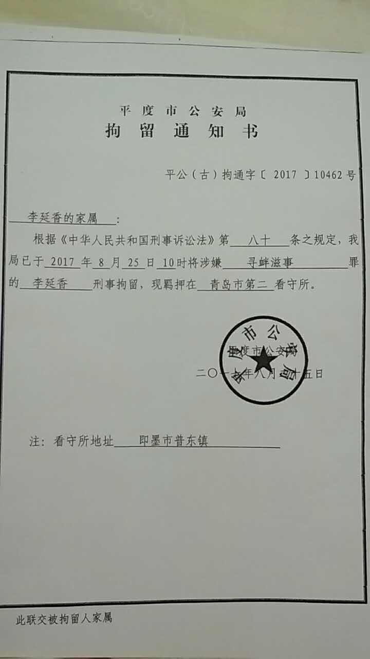 李延香等人被青岛警方连夜从北京带回当地,随即被行政拘留十天。拘留至第八天,即8月25日,警方通知家属,称李延香被转为刑事拘留,罪名为“寻衅滋事”,而孙宗勇等人在行拘十天到期后被释放。