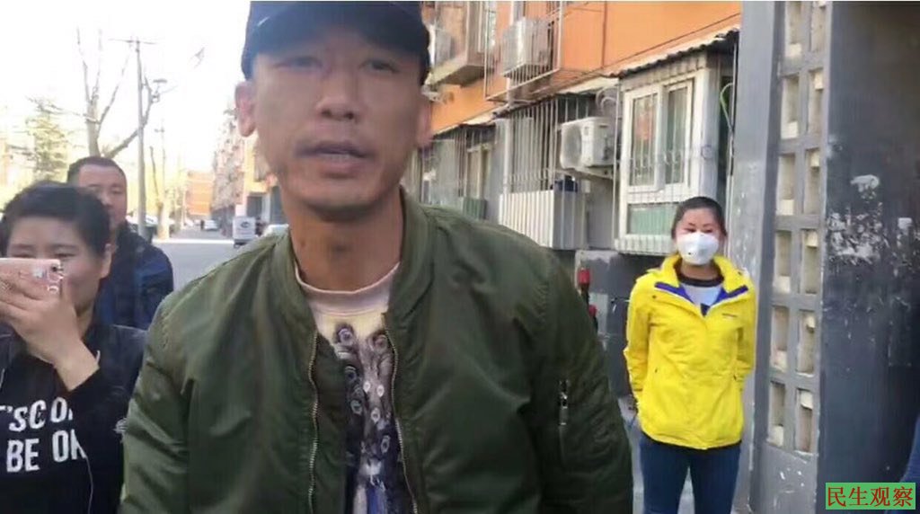 上午十一点左右,“709案”另外两名家属王峭岭和樊丽丽来到现场。据王峭岭提供的视频可以看到,她俩一出现立即遭到图示该名男性便衣国保(图二)带同多名大妈的围攻,恐吓王峭岭的正常证据采集拍摄,并试图动手抢夺王峭岭手机,未成功。王峭岭与樊丽丽原本打算上楼陪李文足母子一起吃午饭,但“朝阳大妈”稳坐楼道防盗门口,坚决不让王樊二人上楼,并对二人不停谩骂推搡,过程中王峭岭眼镜被对方损坏。