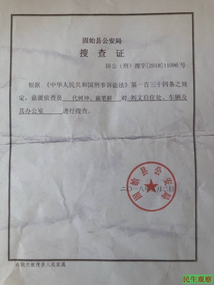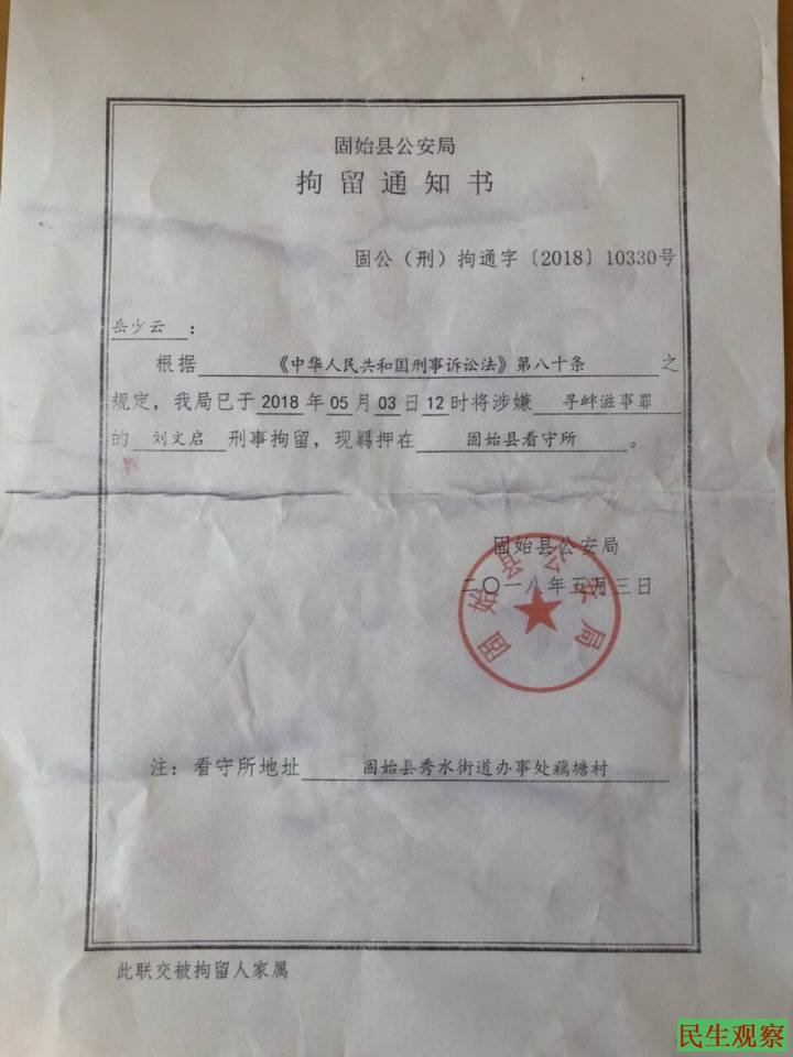 在发帖后的第二天,即5月2日刘文启就被固始县公安局警察从家中带走,当天被警察抄家,第二天被以涉嫌“寻衅滋事罪”刑拘。