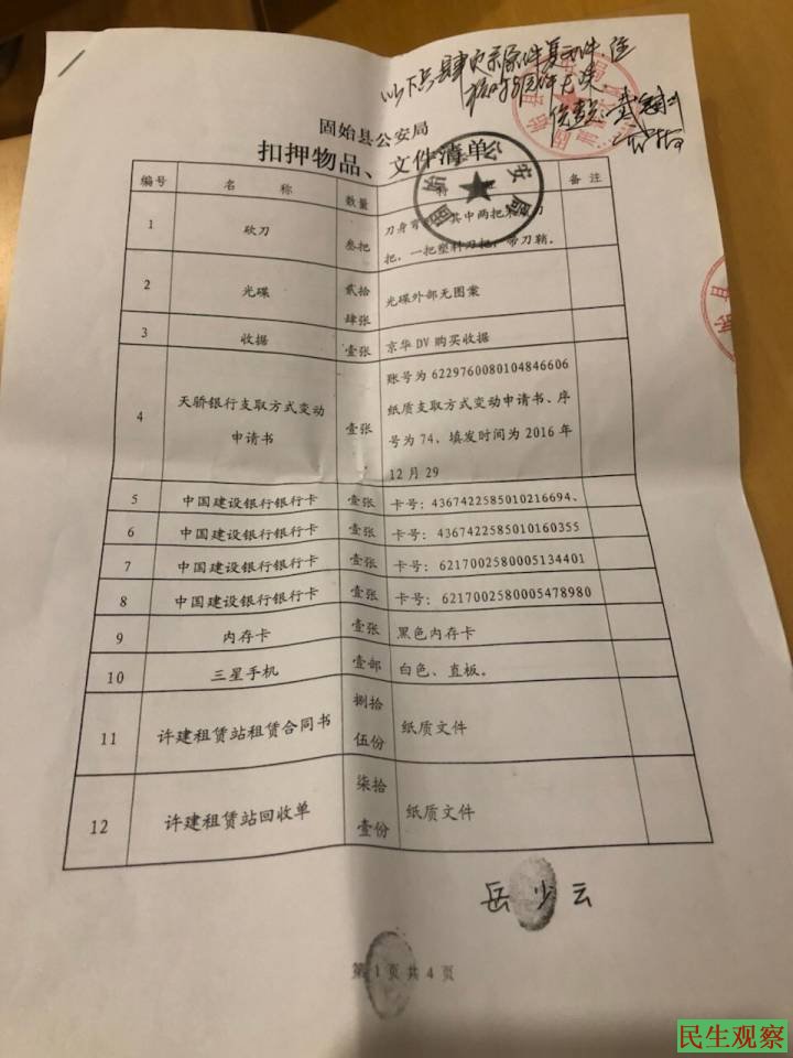 另据刘文启妻子岳女士反映,刘文启被刑拘后,她马上为丈夫聘请了律师前往拘留所要求会见被拒绝,此次王磊律师前往会见已是第二次被拒绝了。在刘文启被抓当天,也就是3月2日,固始县公安局警方就对丈夫住处、车辆及办公室进行了搜查,查扣物品共计为42件,其中包括银行卡、藏族刀具收藏品、收据、合同、日记本、手机、控告信等等。当时警察在她家中搜出两千多元现金也要扣押,她再三哀求说明是一家人生活费用才没有被扣押。另外,还将夫妻俩用于接送孩子上学的别克汽车也开走扣押,而汽车居然没登记在扣押清单上。扣押完毕后,办案警察没有把扣押清单当场给她,后王磊律师于5月8日上午给固始县公安局办案人员当面提出,8日下午才把扣押清单给她。