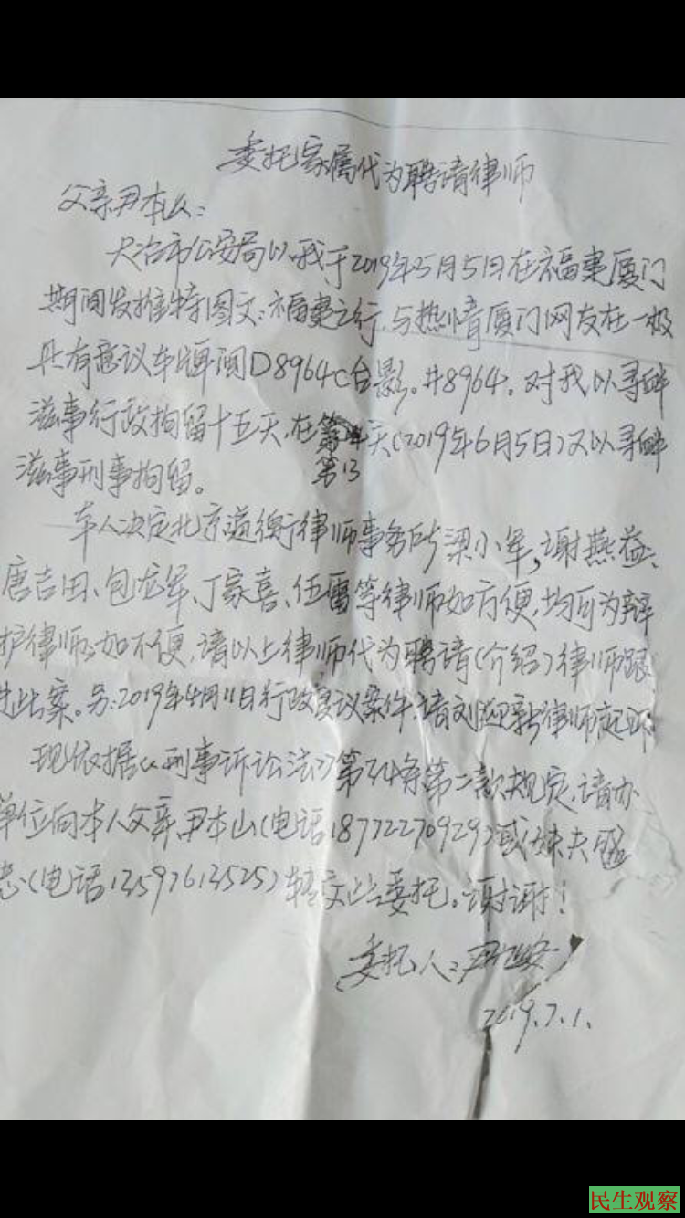 尹旭案还在家书中表示:“5月5日途经厦门时,我发布了一条推特‘福建之行,与热情的厦门网友在一辆极具意义的车牌闽D8964C合影#8964’”。因此被以寻衅滋事行政拘留15天,2019年6月5日又被以涉嫌寻衅滋事罪刑事拘留。在家书中尹旭安告诉父亲,决定聘请梁小军、谢燕益、唐吉田、包龙军、丁家喜、伍雷等律师在方便的条件下均可为自己的辩护律师,如不便可请以上律师代请其它律师跟进。