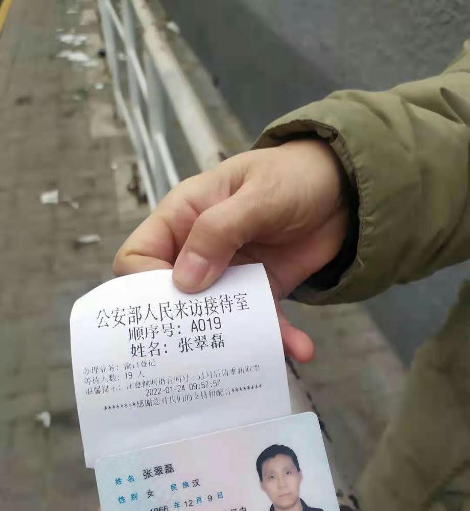 【民生观察2022年1月26日消息】元月24日中午10点多河北访民张翠磊到公安部登记维权,张翠磊依法逐步维权到北京,因石家庄市长安区法院执行局局长李新革在执行法院判决书时故意拖延不执行,因此,导致张翠磊走上了维权之路。
