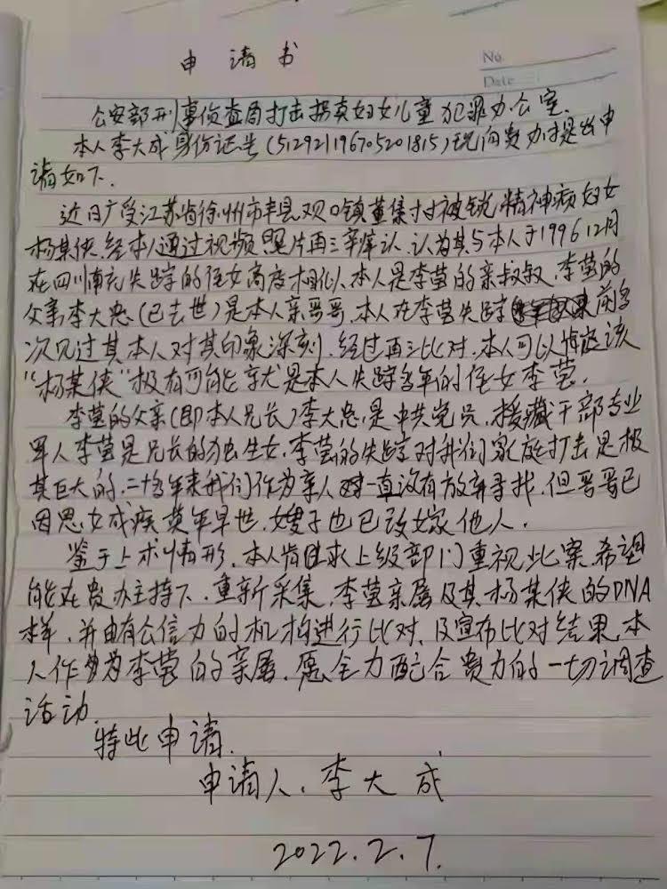 目前李莹的父亲已因思女成疾去世,母亲已经改嫁,李莹父亲李大忠的弟弟、李莹亲叔叔李大成手写申请书:确认徐州丰县被锁虐、被拐卖、强奸的女性与其失踪多年的侄女李莹极其相像。要求公安部刑侦局打拐办调查此案,要求对杨某侠与李莹的亲属现在重新采集样本进行DNA亲子亲缘鉴定,并要求第三方机构对鉴定进行监督。以下为申请书全文: