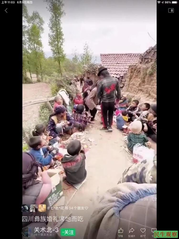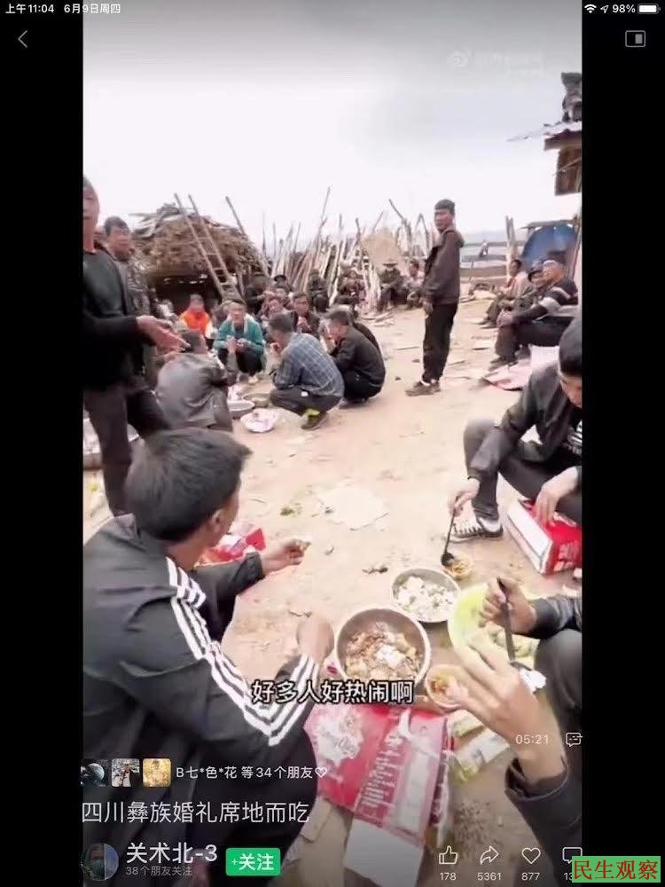 网友陈建拍摄了四川凉山一家农户结婚场景后发布在自媒体上,近几天在无数个微信群里广为流传。视频显示,全村的老老少少一起席地而坐吃酒席。不光是外面坐满了人,屋子里面也坐满了人。新房破败不堪,酒席上只有豆腐酸菜汤。当地的人们很是热情,来者即是客,招呼一起吃饭。凉山那边的女生笑容特别淳朴。男人的笑容也很淳朴。还邀请网友有机会再过来一起玩。图片上传到社交媒体后成为关注焦点。