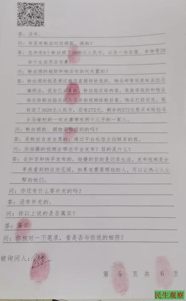 当日下午三点半左右,美姑县公安局人员又上门找陈建谈话且作了讯问笔录,并且还要求他写下了保证书。还问了拍视频的经过;是否涨粉和盈利也是凉山当地所作笔录的重点;不少网友在看了那个视频后,给那户办喜酒的人家捐了钱和物。
