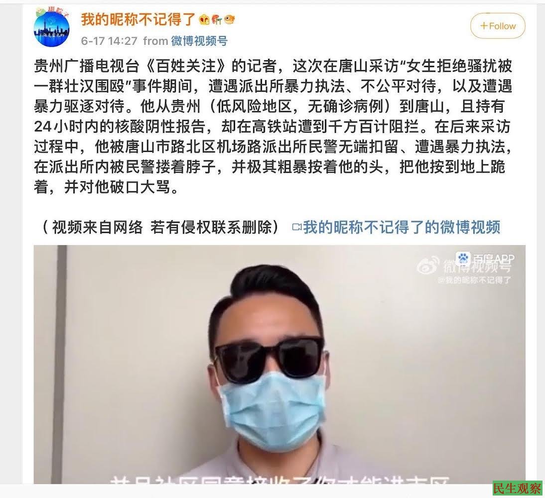 贵州广播电视台《百姓关注》的记者张巍瀚,前往唐山采访唐山被打女孩情况,他从贵州(低风险地区,无确诊病例)到唐山,且持有24小时内的核酸阴性报告,却在高铁站遭到千方百计阻拦。
