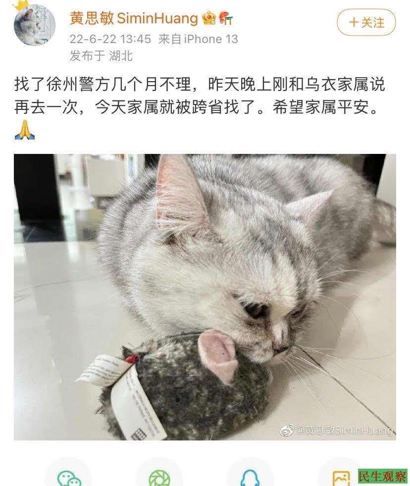 2022年6月22日黄思敏律师微博消息:找了徐州警方几个月不理,昨天晚上刚和乌衣家属说再去一次,今天家属就被跨省找了,希望家属平安。
