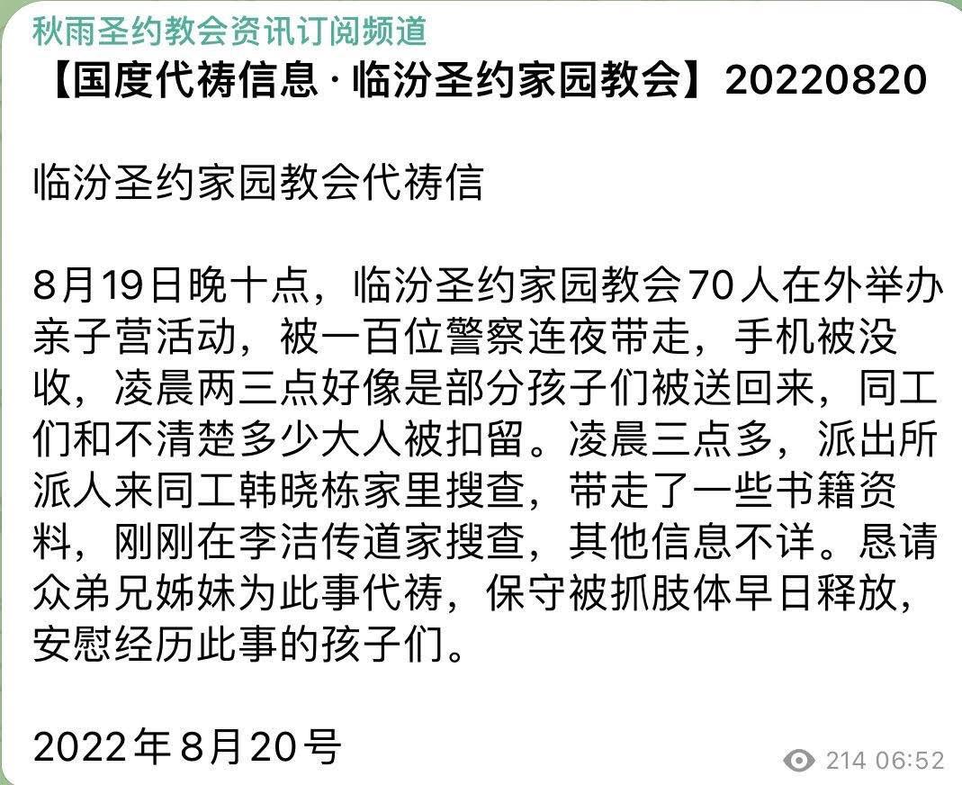 另外,2022年8月20日临汾圣约家园教会发出代祷信:2022年8月19日晚十点,临汾圣约家园教会70人在外举办亲子营活动,被一百位警察连夜带走,手机被没收,凌晨两三点好像是部分孩子们被送回来,同工们和不清楚多少大人被扣留。凌晨三点多,派出所派人来同工韩晓栋家里搜查,带走了一些书籍资料,刚刚在李洁传道家搜查,其他信息不详。恳请众弟兄姊妹为此事代祷,保守被抓肢体早日释放,安慰经历此事的孩子们。