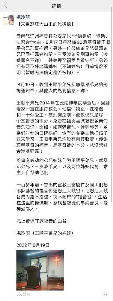 2022年8月17日,云南怒江州福贡县公安局以涉嫌“组织、资助非法聚会”为由,将怒族90后基督徒王顺平弟兄刑事拘留;一位怒族弟兄怒桑邓弟兄被以同样罪名拘留、三罗波弟兄也被刑事拘留(涉嫌罪名不详),并关押至福贡县看守所。另外,还有两位外地籍姊妹(不知姓名),目前情况不明(暂时无法确定是否被拘)。