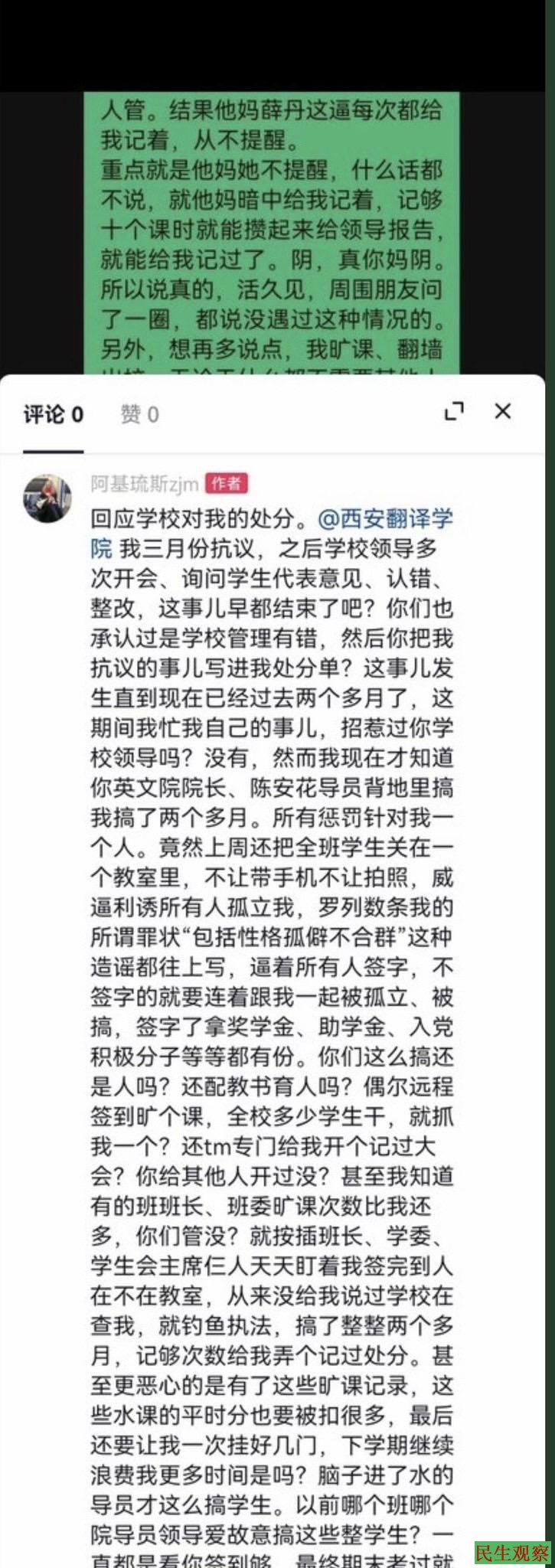 【民生观察2023年5月29日消息】2023年5月28日,此前3月在西安翻译学院食堂演讲,抗议学校半封闭管理的学生张某木,在时隔两个月后遭到了学校的违纪处分。对于学校的处分决定该生拒绝在告知书上签字,并发文回应了学校的处分决定。