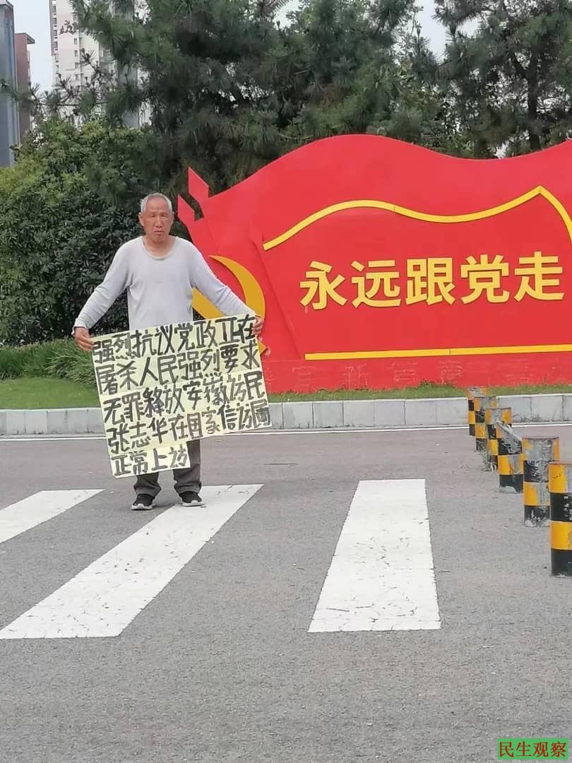 【民生观察2023年6月5日消息】2023年6月3日江苏省邳州市吴继新在六四前一天到永远跟党走牌子前拉条幅:强烈抗议党、政正在屠杀人民!强烈要求无罪释放安徽省访民张志华!在囯家信访局正常上访,被当地政府官员要求回当地解决问题为由骗回去被拘留10天,目前家属没有收到任何法律文书。