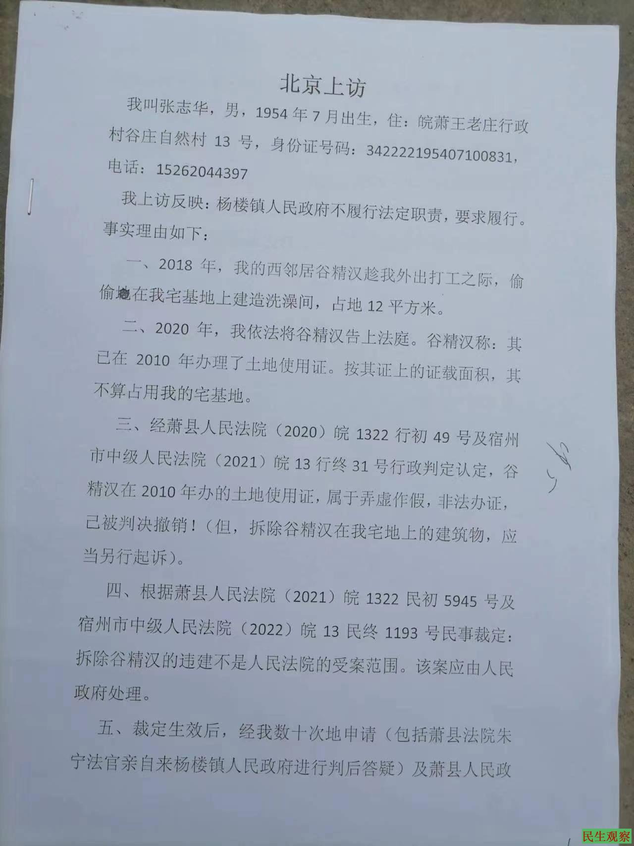 张志华2018年3月打工之际回家后发现自家的宅基地被本村农民谷精汉占用建洗澡间,占地面积12平方米,经多方协调未果的情况下在2020年起诉到法院,随后就走上了维权上访之路。
