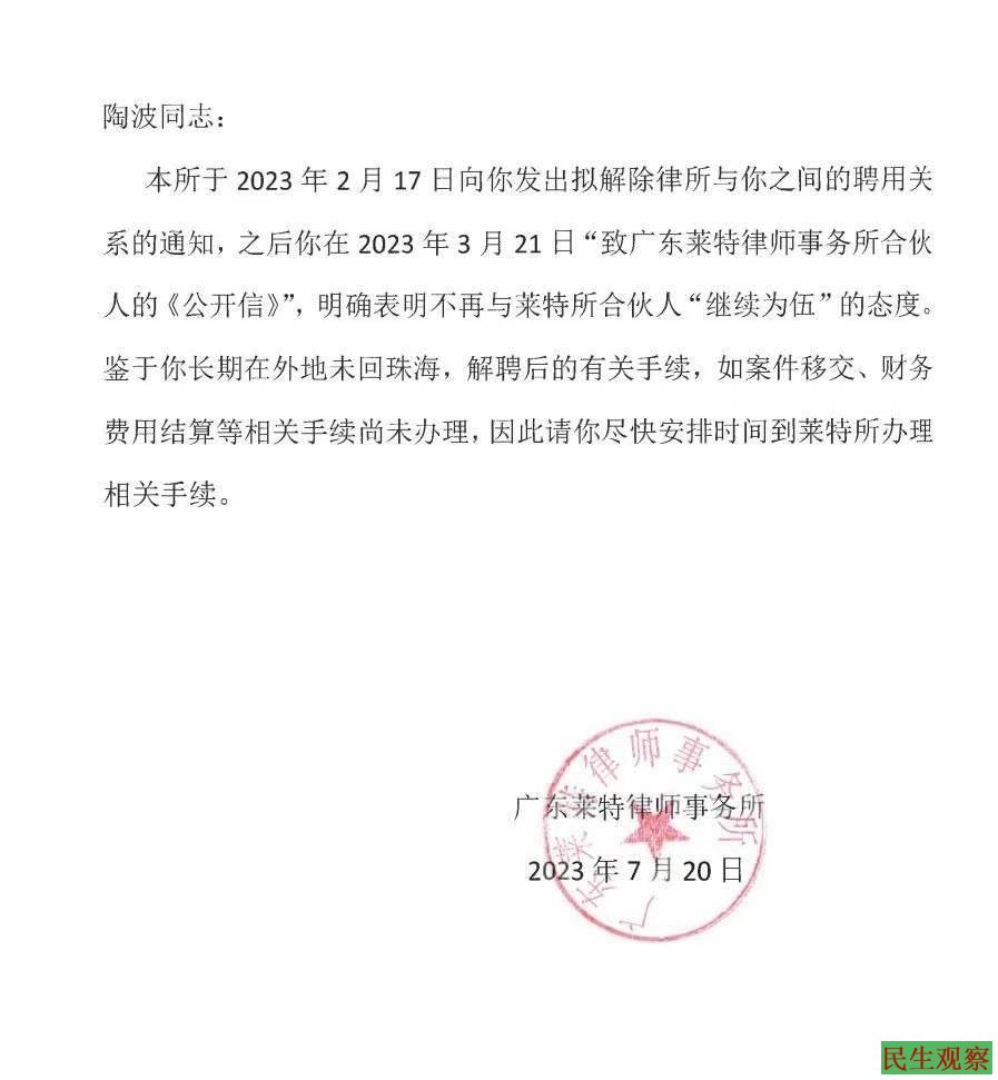 据一份书面通知书显示,2023年2月17日,广东莱特律师事务所向陶波律师发出拟解除律所与他之间聘用关系的通知,之后陶律师在2023年3月21日“致广东莱特律师事务所合伙人的《公开信》中”,明确表明不再与莱特所合伙人“继续为伍”的态度。