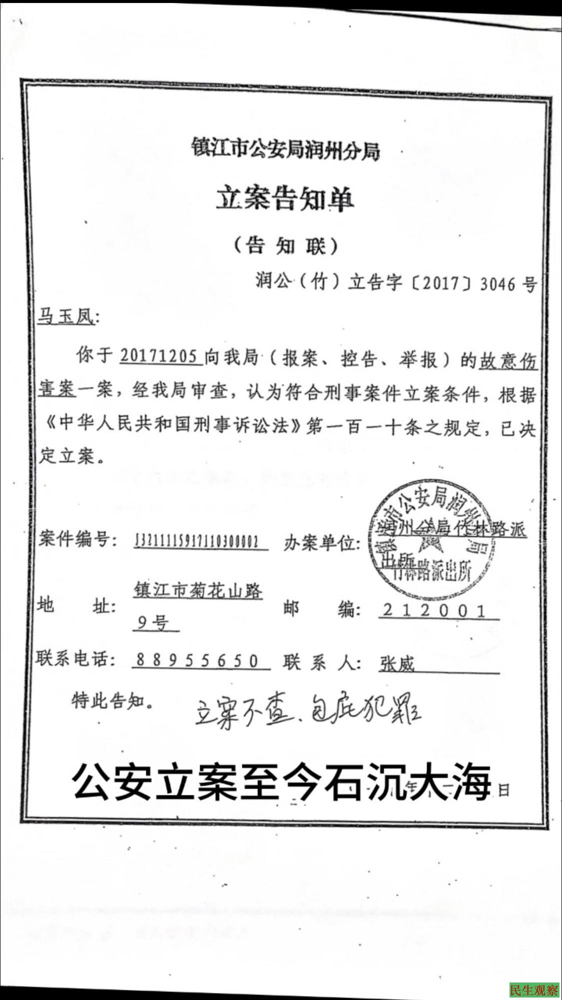 2017年12月4日,镇江市公安局润州区分局对马玉凤人身伤害案件鉴定为轻伤二级;2017年12月5日润州区公安局作出刑事立案决定。