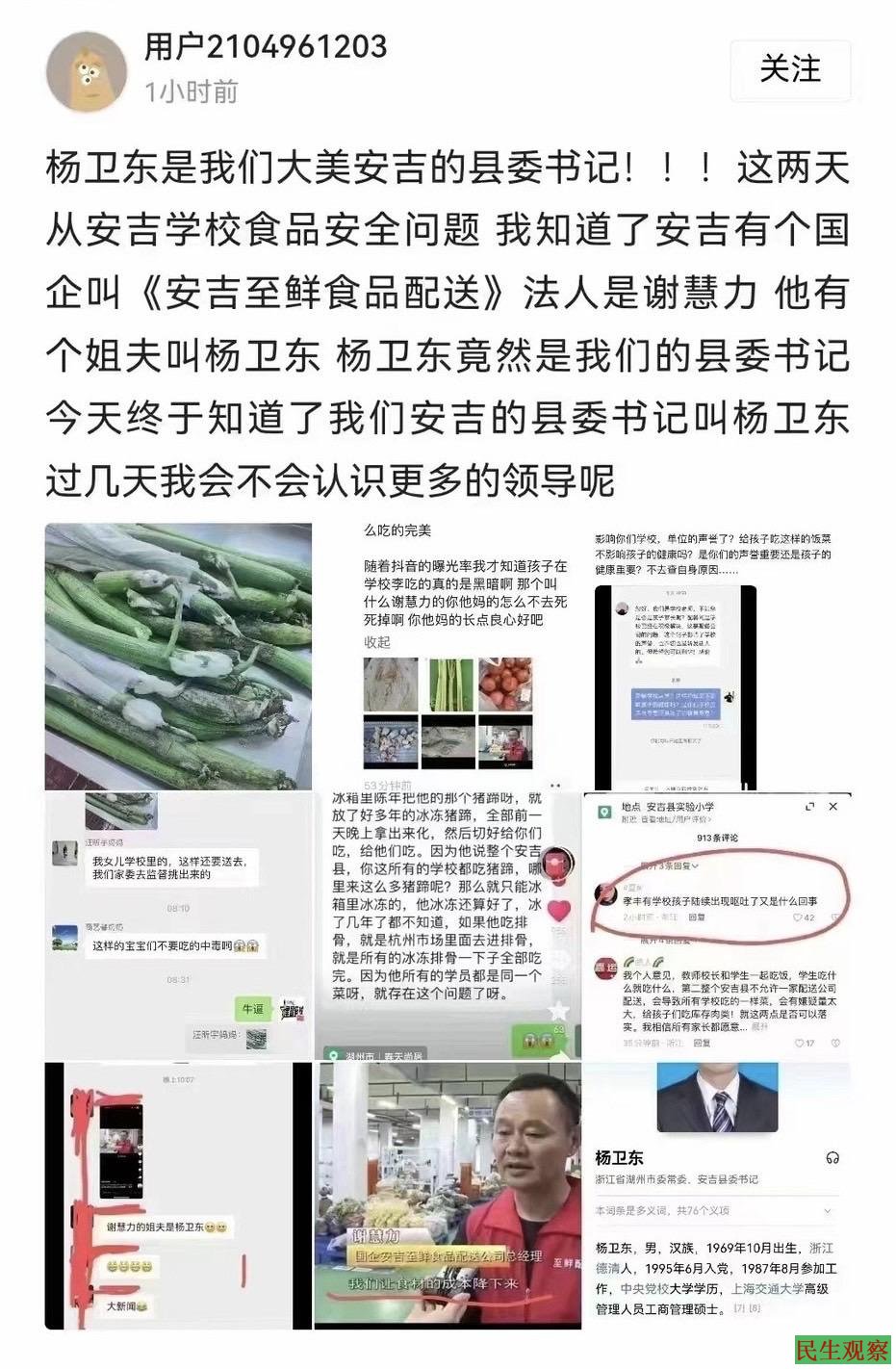 随后有家长爆料,杨卫东是我们大美安吉的县委书记!这两天从安吉学校食品安全问题,我知道了安吉有个国企叫《安吉至鲜食品配送》法人是谢慧力,他有个姐夫叫杨卫东,竟然是我们的县委书记。今天终于知道了我们安吉的县委书记叫杨卫东,过几天我会不会认识更多的领导了。