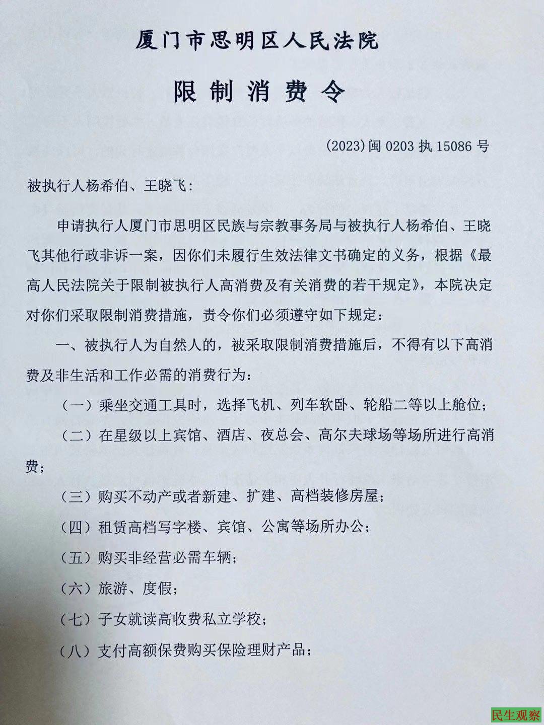 厦门市思明区法院“限制消费令”称,申请执行人厦门市思明区民族与宗教事务局与被执行人杨希伯、王晓飞其他行政非诉一案,因被执行人杨希伯、王晓飞未履行生效法律文书确定的义务,根据《最高人民法院关于限制被执行人高消费及有关消费的若干规定》,本院决定对二人采取限制消费措施,责令二人必须遵守如下规定: