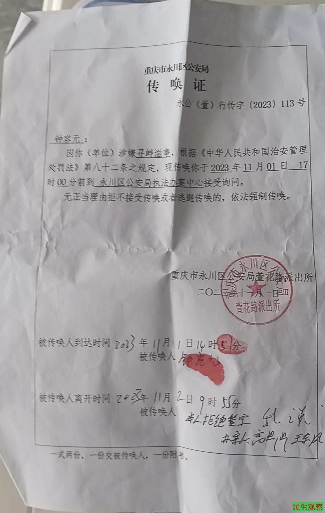 据传唤证显示,重庆市永川区萱花路派出所以钟容元涉嫌寻衅滋事为由,对其进行传唤,要求她于2023年11月1日17:00分前到永川区公安局执法办案中心接受询问。最下方显示,钟容元于2023年11月2日9时55分离开派出所,并拒绝在该传唤证上签字。