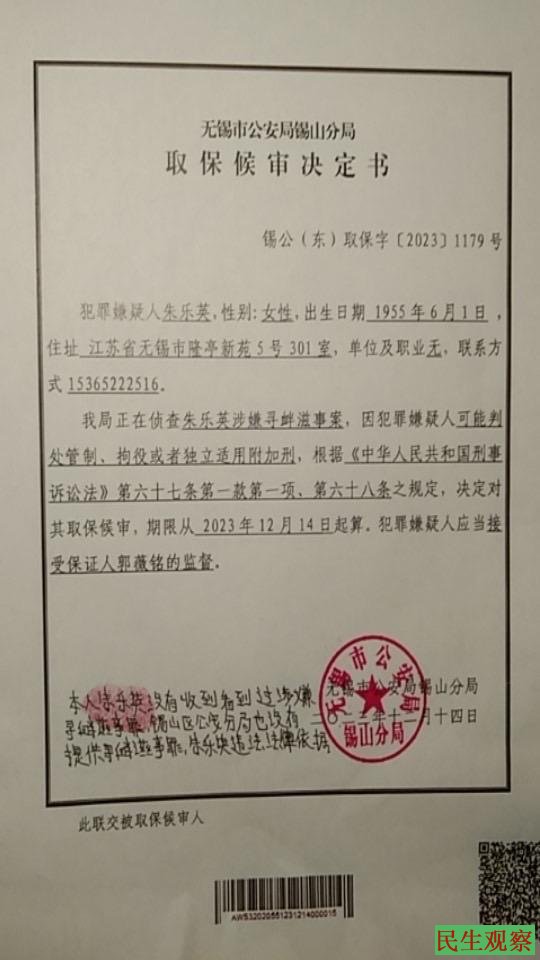 【民生观察2023年12月17日消息】近日,江苏省无锡市锡山区东亭街道的朱乐英,前往北京信访并旅游,被东亭派岀所人员强行带回后,以寻衅滋事为由连续传唤并抄家。为了防止其再次前往北京上访,警方对朱乐英作出取保候审的决定。