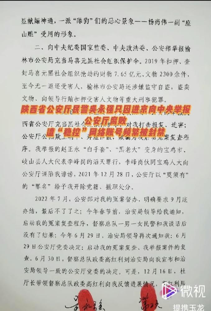 三、陕西省公安厅充当黑社会的保护伞,对吴永强进行打击报复、迫害;公安厅公然欺上瞒下,弄虚作假,欺骗为他启动冤案复查程序。吴永强举报的赵正永“白手套”、“黑老大”变身的宝鸡市岐山县人大代表李峰岗的滔天罪行,李峰岗伙同宝鸡人大向公安厅诬陷吴永强诽谤,2021年12月28日,公安厅以“莫须有”的“罪名”给予吴永强开除党籍,撤职处分。