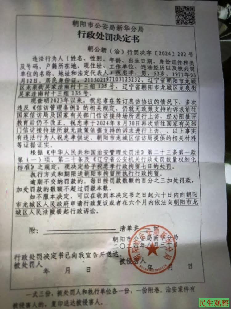 【民生观察2024年9月9日消息】辽宁维权人士祝忠孝在2024年8月30日上午在北京东堂子胡同西口协和医院旁边的米市大街公交站被辽宁朝阳区公安局新华分局李建等人拦截,报警后被建国门派出所。以职务行为为由不予立案,只能回地方公安局纪检监察控告,随后又在北京南站106路公交终点站,再次被辽宁朝阳市公安局新华分局七人绑架到驻京办实施打击报复,捏造证据向领导上交所谓的笔录,将祝忠孝投进辽宁省朝阳市拘留所,拘留的所谓理由是:依已签订了息访罢诉协议再次上访,给予行政拘留,2024年9月7日拘留期满释放回家。