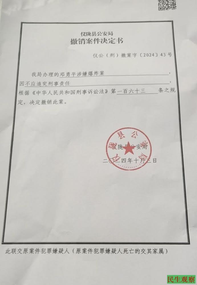 2024年10月3日,家属收到了书面的通知书,仪陇县公安局办理的邓勇平涉嫌爆炸罪一案,因不应追究刑事责任,根据《中华人民共和国刑事诉讼法》第一百六十三条之规定,决定撤销此案。