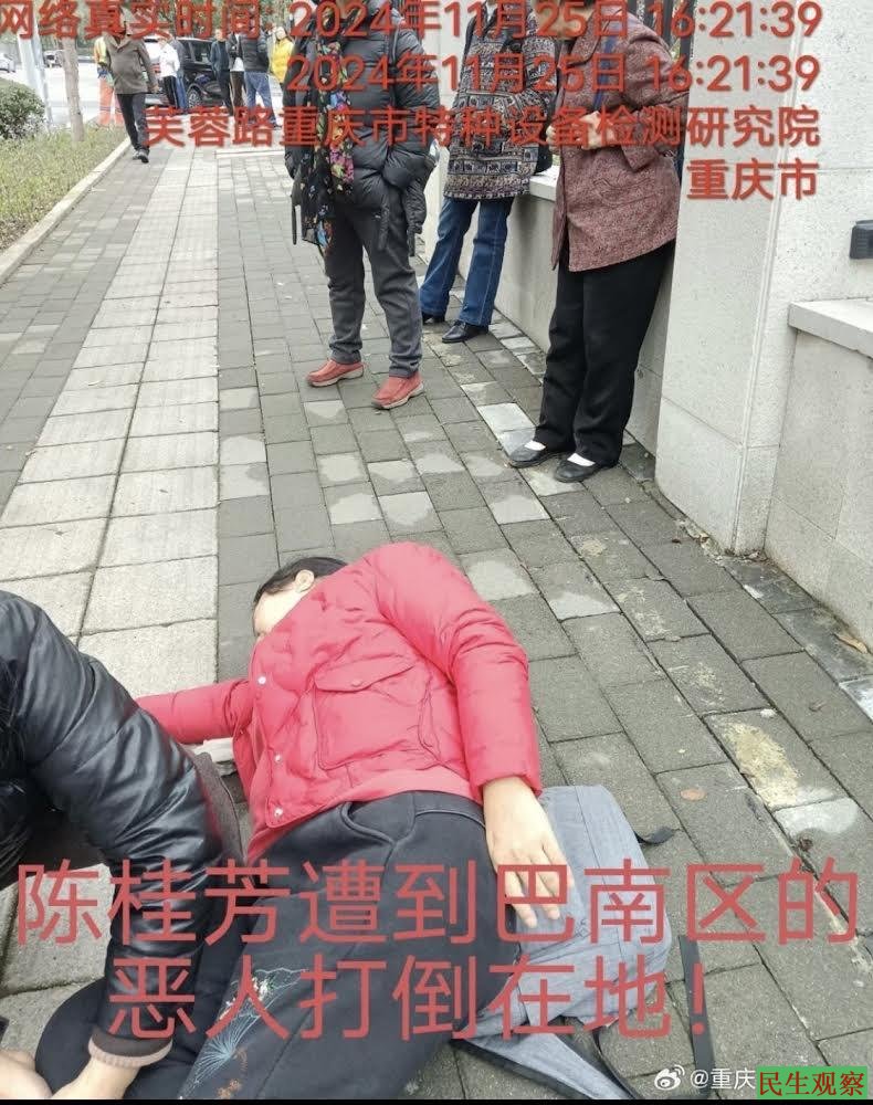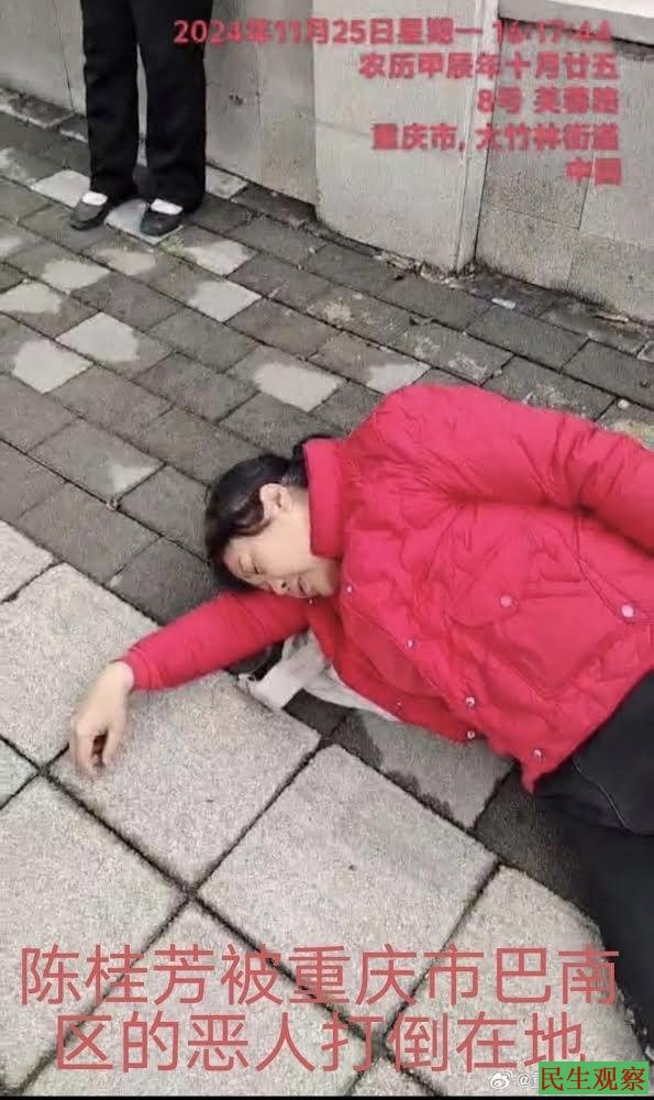 在现场的重庆涪陵区维权人士陈桂芳,劝巴南区的工作人员不要再暴力绑架视力残疾人赵维智,结果被一群巴南区的工作人员恶意的“寻衅滋事”,把陈桂芳拳打脚踢打倒在地上。