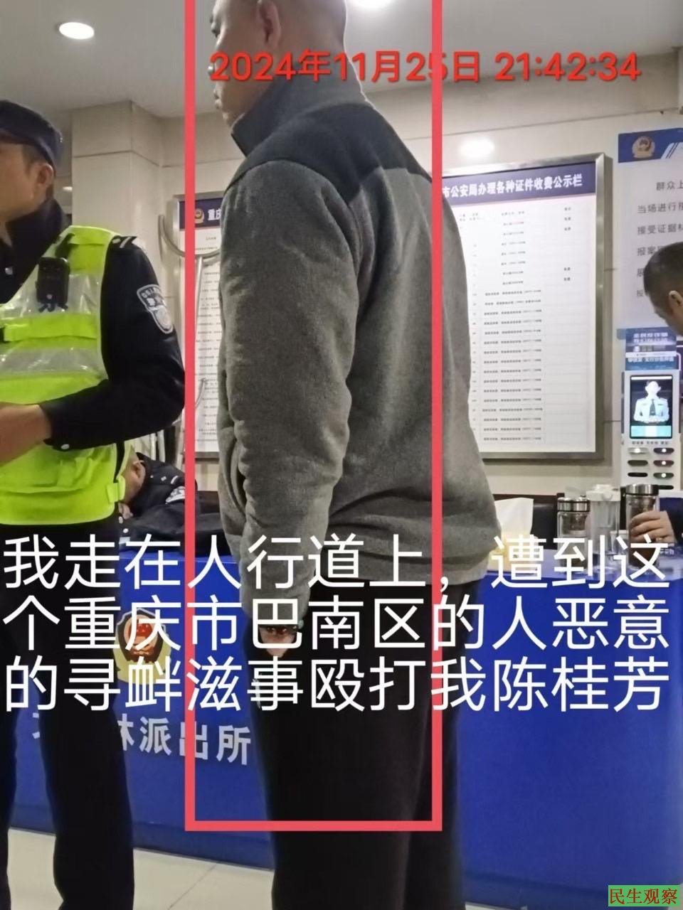 陈桂芳在派出所坐了两个多小时的冷板凳,才对她进行询问笔录。后在陈桂芳的强烈要求下,晚上十点多钟对肇事者之一的男子进行调查,肇事者反映还有其他凶手,民警刘爽说要一个一个的进行调查,直至2024年11月26日凌晨1点半,陈桂芳在又饿又冷痛的情况下被迫离开大竹林派出所,也没有看到该派出所对另外的肇事者进行调查。