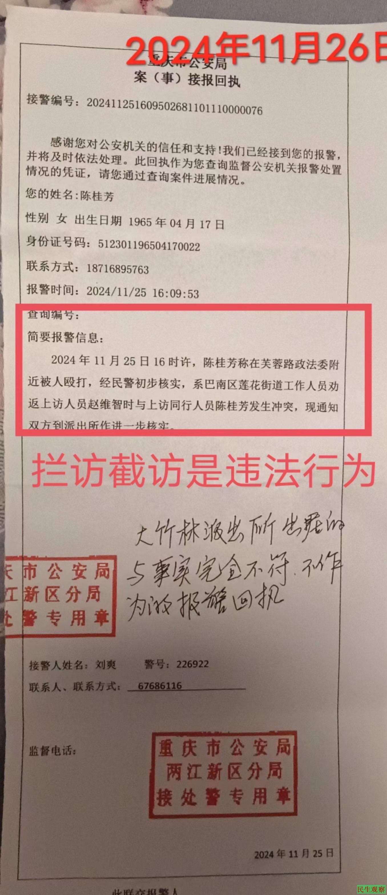 从2024年11月25日晚12点前,大竹林派出所给陈桂芳开具的是不实的报警回执,旁人多次提出异议,报警数十次要求警方开具真实的报警回执,民警刘爽置之不理,随后悄然离开。
