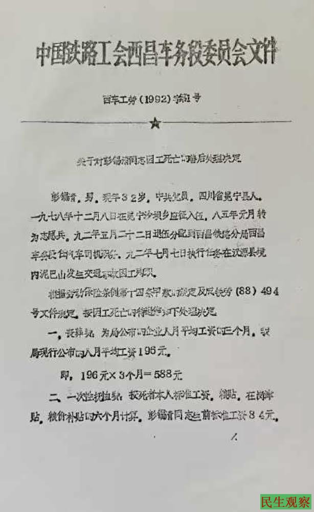 倘若按中国铁路工会西昌车务段委员会文件西车工劳(1992)字第1号,彭锡清如果真的是“九二年七月七日执行任务在汉源县境内泥巴山发生交通事故因工殉职”的话,那么,俗话说“不以规矩,不能成方園”。
