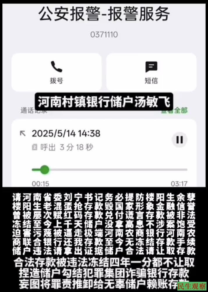 另外,2025年5月8日——9日,中央巡视组进驻河南后,数十名河南村镇银行储户前往河南,并成功预约到和巡视组面访的机会,岂料在面访前夕,储户们被多名便衣非法囚禁在中州国际饭店和锦华酒店,并被禁止和巡视组见面。储户们在酒店大喊:“我们要自由,我们要存款,救命啊”。