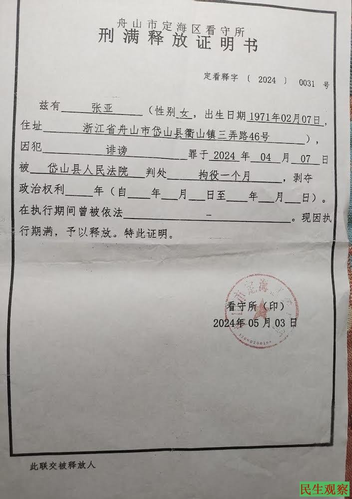 2024年4月7日,张亚被岱山县法院以诽谤罪判处拘役一个月。