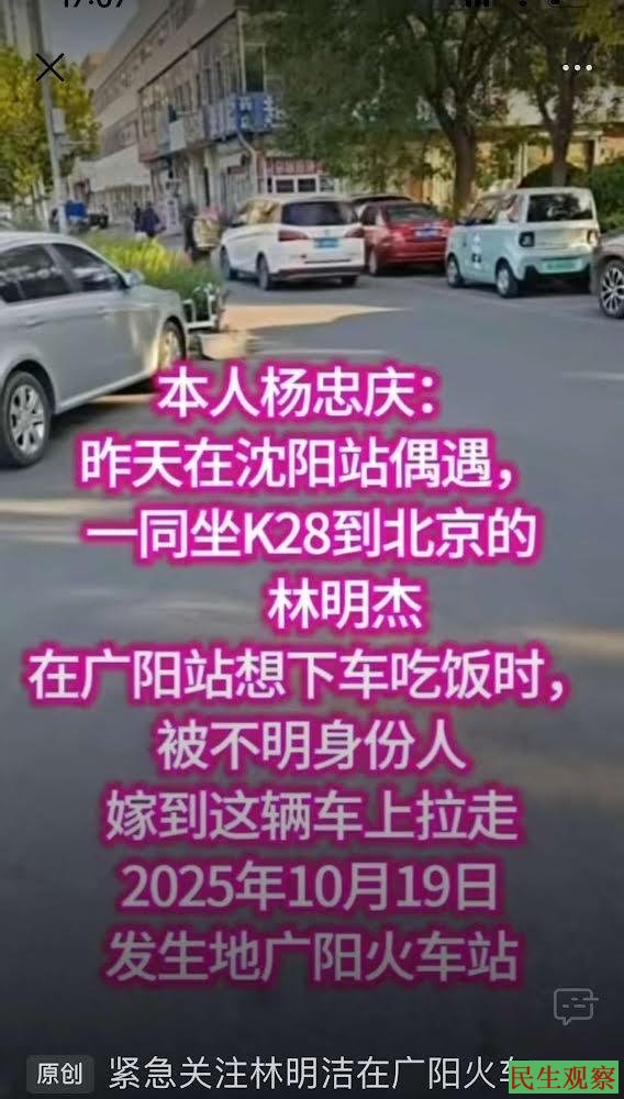 据目击者杨忠庆描述,2025年10月19日上午,他在沈阳站偶遇一同坐K28到北京的林明杰,其在广阳站想下车吃饭时,被不明身份人员架到一辆白色的汽车上拉走。