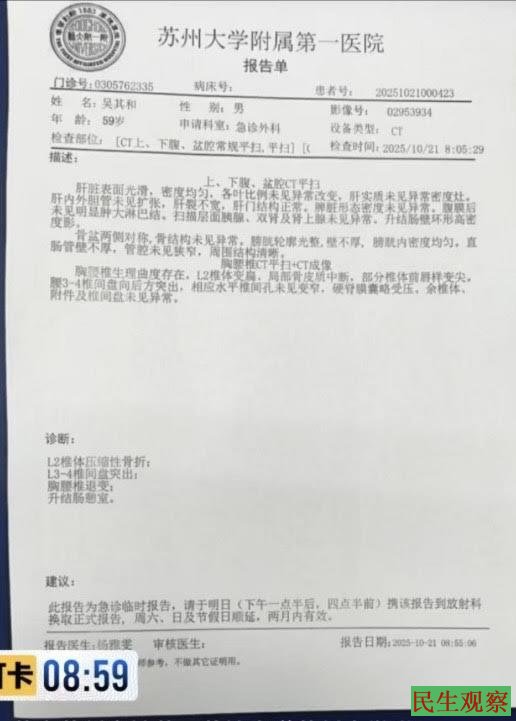 【民生观察2025年10月22日消息】近日,江苏省苏州市姑苏区维权人士吴其和惨遭苏州黑恶公权的迫害。因此前吴其和一直在举报控告当地派出所和街道办滥用职权、伪造公文、构陷罪名、对其打击报复,吴其和家门口长期有政府雇佣人员进行看守,只要吴一出门就被这些人员跟踪盯梢。昨日,吴其和出门照例被这些人跟踪盯梢,因他们追赶吴其和,导致吴摔倒在小区的绿化草坪上,造成腰部骨折。