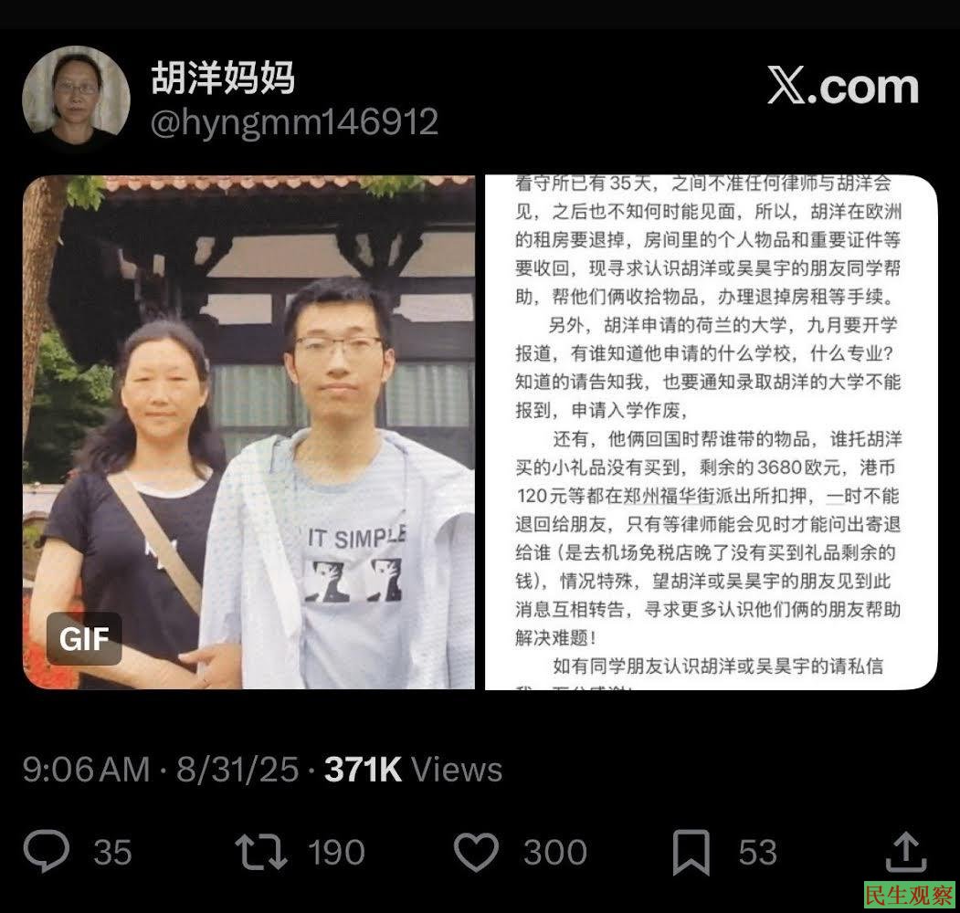 【民生观察2025年11月3日消息】荷兰留学生胡洋暑假回国探亲,被河南郑州警方以寻衅滋事罪刑拘逮捕羁押已有3个多月时间,期间不允许律师会见。近日,胡洋母亲遭警方约谈,警方还是拒绝律师会见,且要求胡洋母亲删帖。