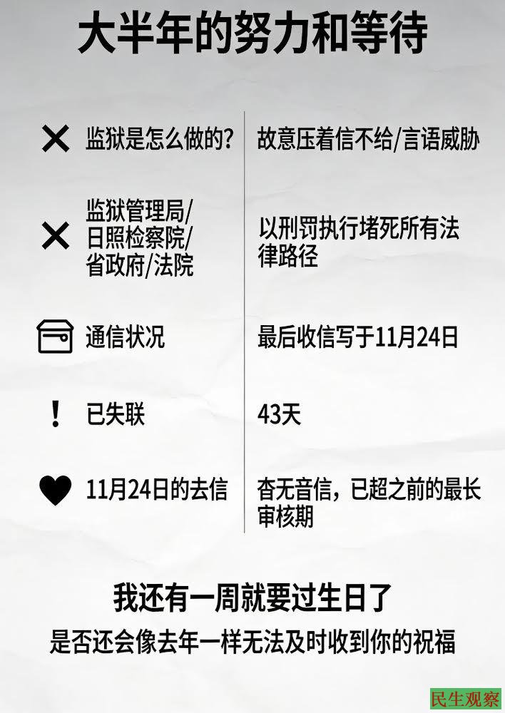 【民生观察2026年1月8日消息】山东省鲁南监狱故意积压许志永未婚妻李翘楚的信件;要求修改,完全照做却还是被扣;威胁李翘楚“不要再寄法律文件”,明确表示“没用”。李翘楚走遍了所有能走的法律程序,但均被以“刑罚执行”堵死。目前李翘楚和许志永已经将近40天不让通信了。