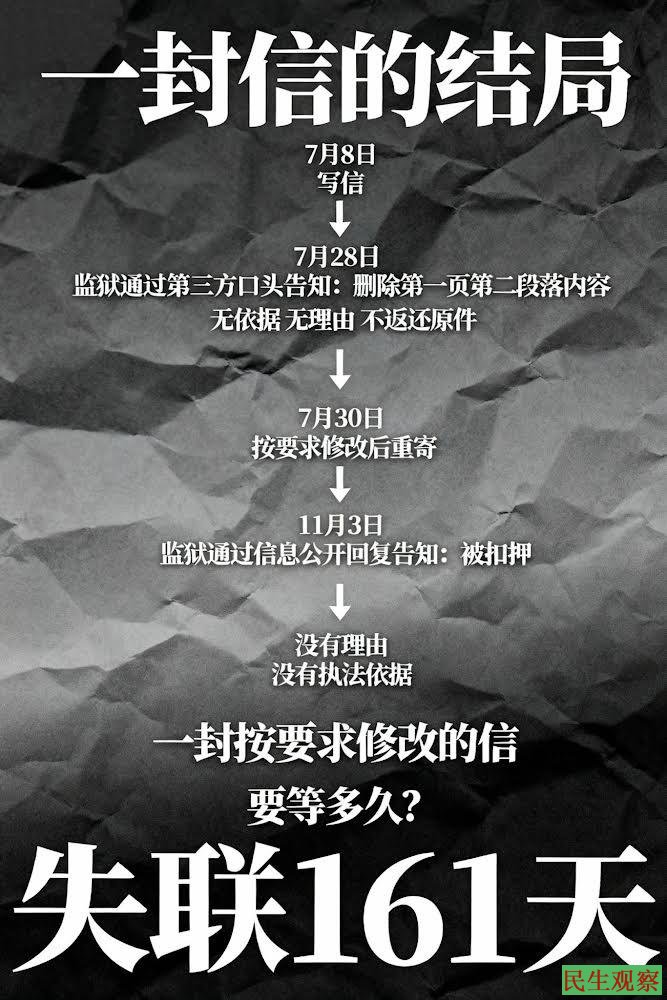 但从2025年4月到现在,大半年的时间里:监狱故意积压信件,最长的一封压了快两个月,只有在李翘楚提交信息公开申请形成压力后才肯送达。监狱要求李翘楚修改信件,她完全照做了,监狱也签收了,却还是被扣押,理由是“未修改”。监狱从不书面告知扣押理由,从不说明法律依据,李翘楚寄了多份函件要求答复,3个月石沉大海。监狱威胁李翘楚“不要再寄法律文件”,明确表示“没用”。