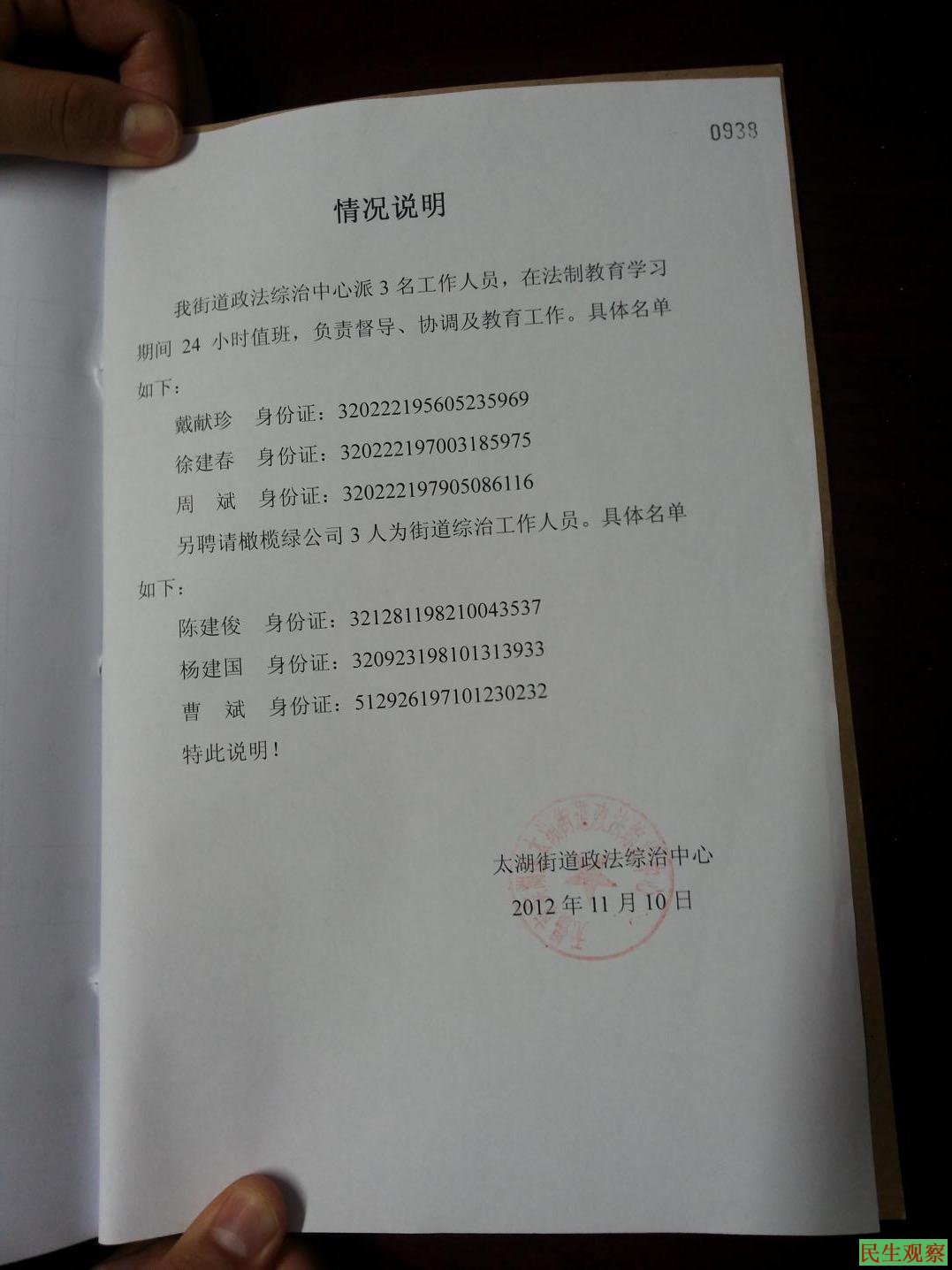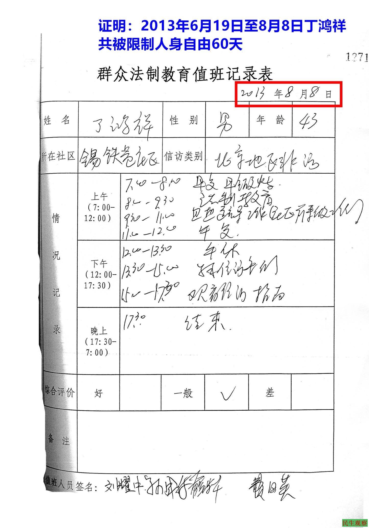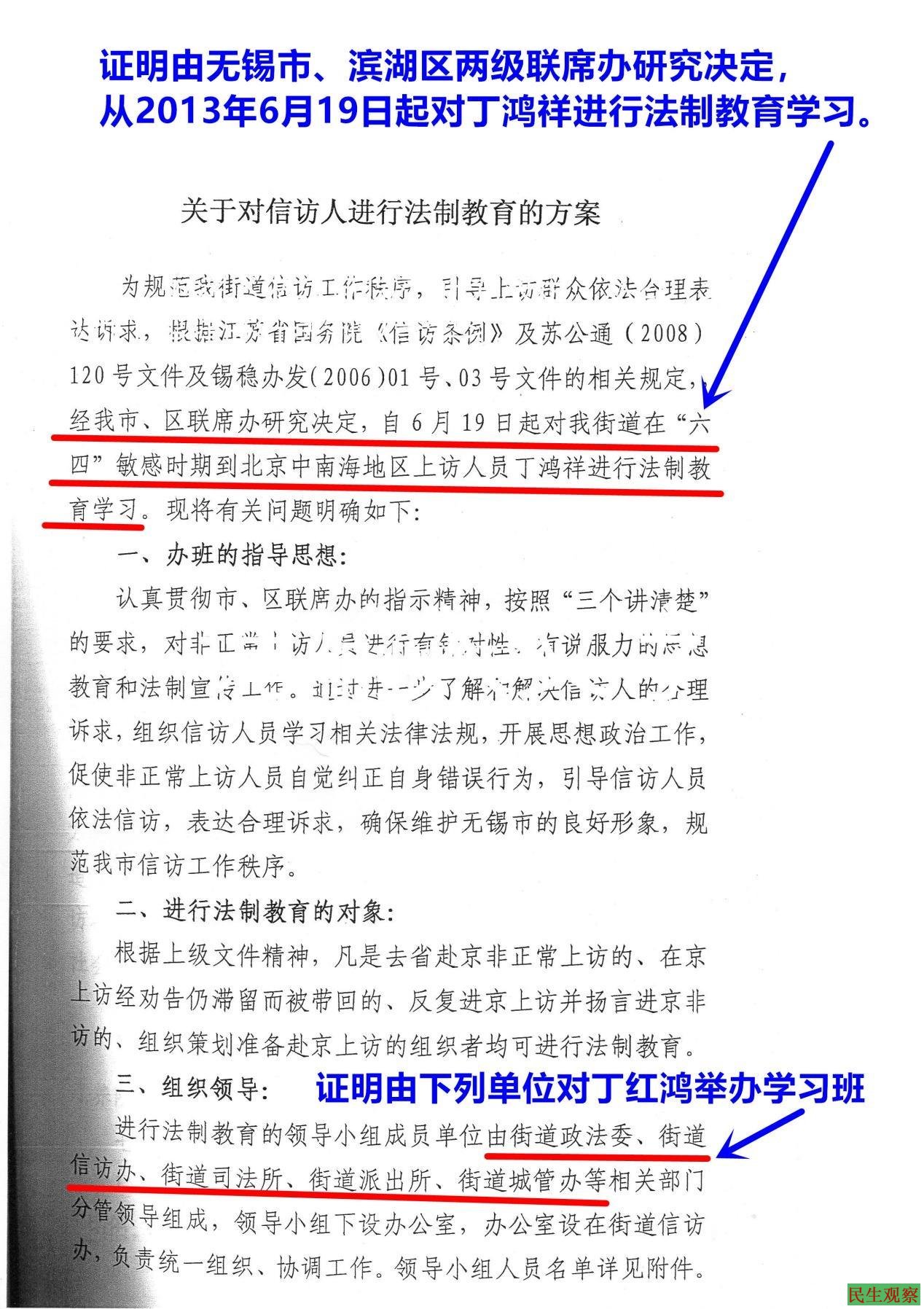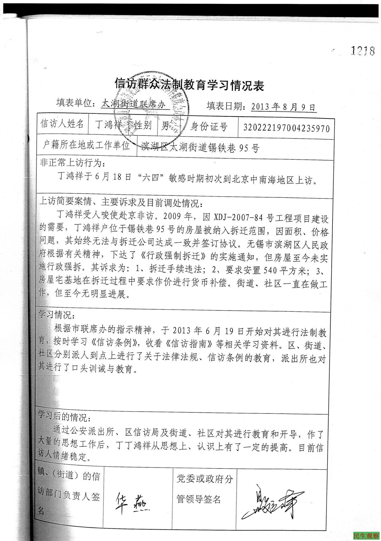 通过多方努力,我们获取到无锡市联席办、滨湖区联席办和太湖街道联席办2013年6月19日对滨湖区五位进京访民(丁国英、丁永金、杨剑艳、周静娟、丁鸿祥)举办“信访群众法制教育学习班”时制作的《信访群众法制教育学习资料》(见附件,以丁鸿祥的为例),五人的《信访群众法制教育学习资料》内容要件基本一致,均为14项内容,这也是迄今为止,全国范围内发现的首例官方“信访群众法制教育学习班”(黑监狱)的文字材料,对研究和揭露那一历史时刻中共无锡的罪恶,具有深刻历史和现实意义。