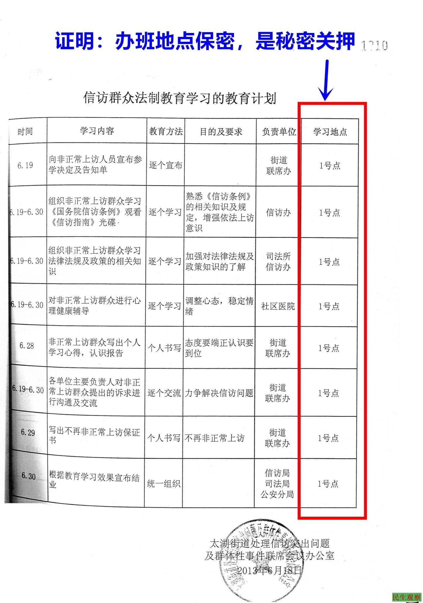 从第3项《信访群众法制教育学习的教育计划》中“学习地点”为“1号点”,即表明办班地点是保密的,不对外公开,即在秘密地点举办“学习班”。