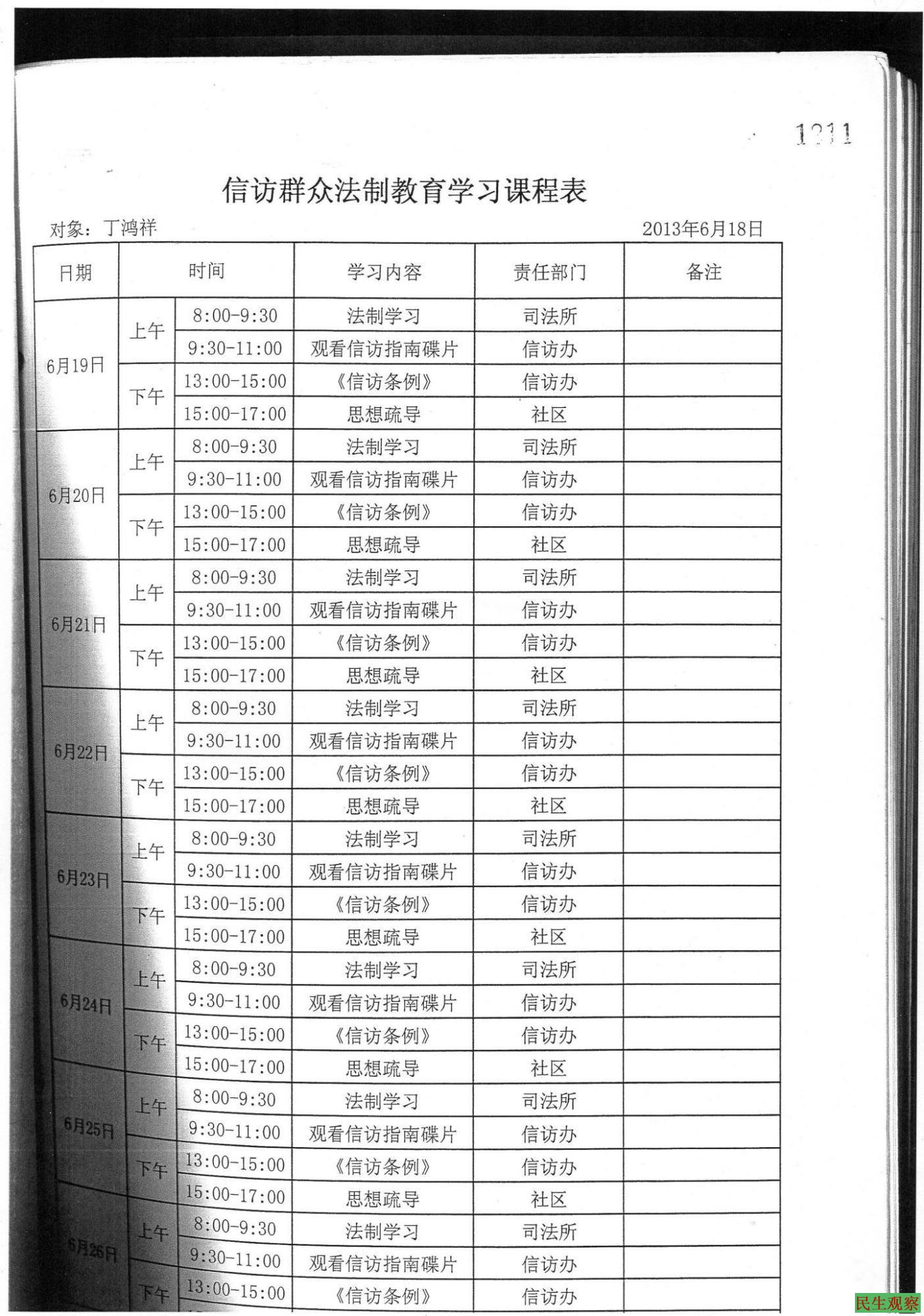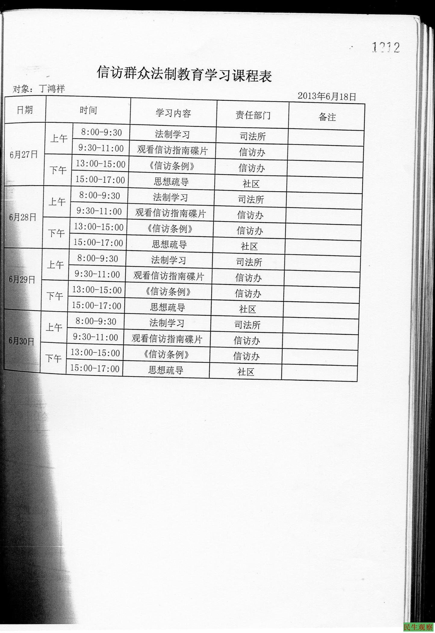 第4项:《信访群众法制教育学习课程表》,学员在学习班期间没有休息。