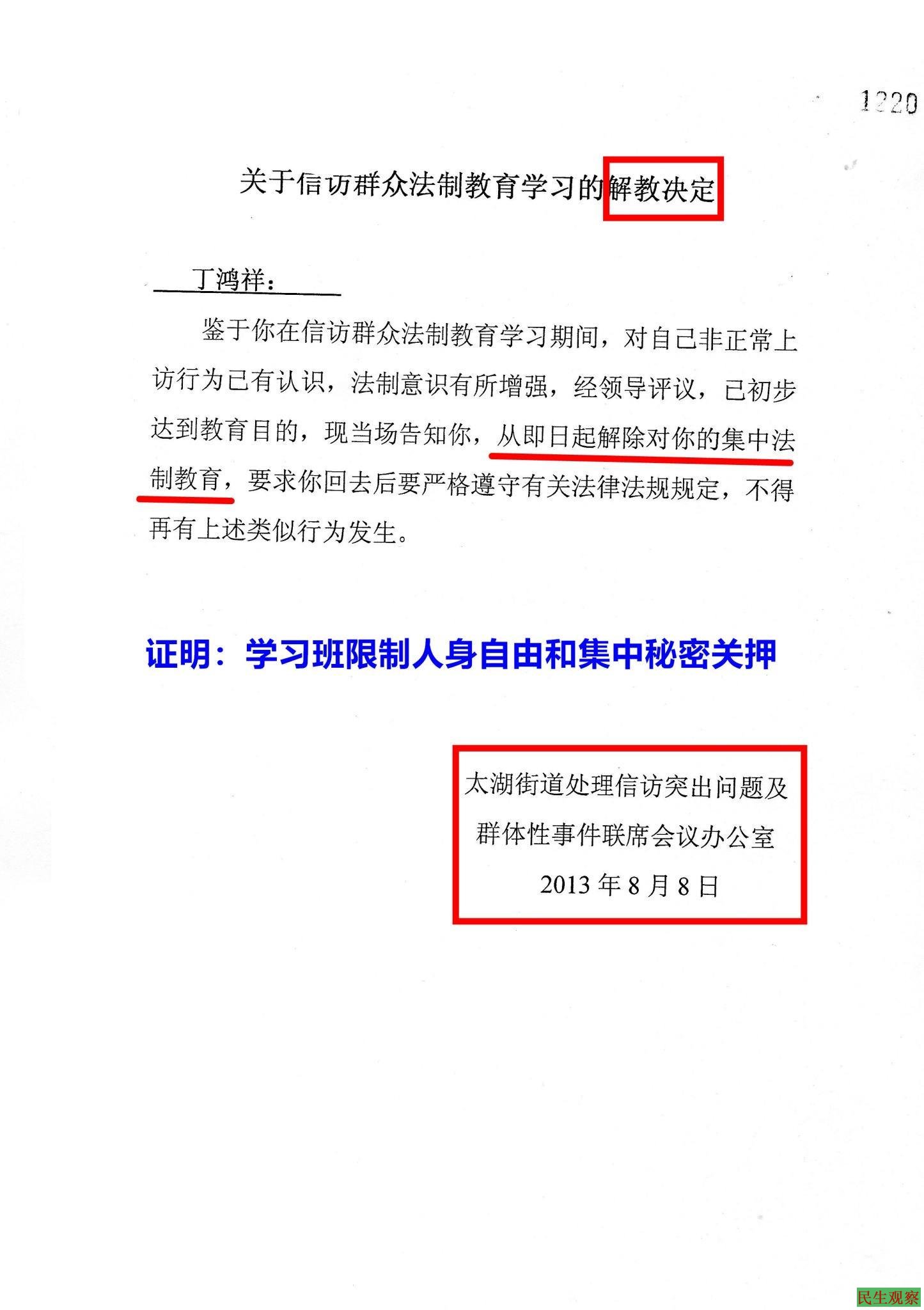 从第9项《信访群众法制教育纪律》即可看到,学员被“强制集中”到一个“秘密地点”,不准会客,必须经联席办审批同意后方可解除教育。实际操作时,学员的所有随身物品是全部被抢走,不仅是不准会客,还不得与外界通讯联系,手机全部被抢。第12项《解除信访群众法制教育学习申请表》和第13项《信访群众法制学习解教告知》与第9项相印证,证明学习班强制秘密非法拘禁访民的事实。 据了解,中共无锡强制对访民举办“学习班”达到1000人次,有的访民一人就被举办十次以上。