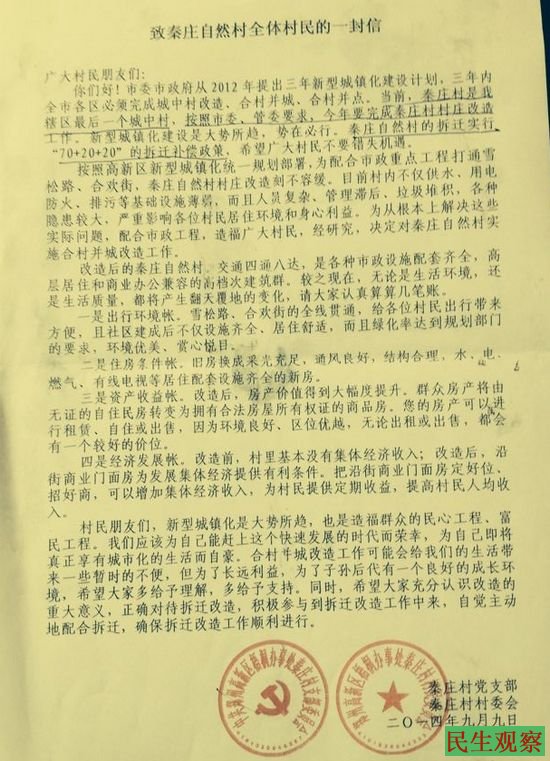 据该村秦女士等人告诉本工作室,她们村有六百多户,近二个月来,秦庄村被纳入了所谓城中村改造,但村民查询拆迁手续时却未查到,看到的却是只有村委会盖章的文件。村里更没有召开村民大会,同意拆迁者都有是村长、队长等人。在补偿这块,村民房子最低的每平米只补四百余元,每人安置房面积也不过70平米。在此情况下,绝大部分人拒绝签字搬迁。