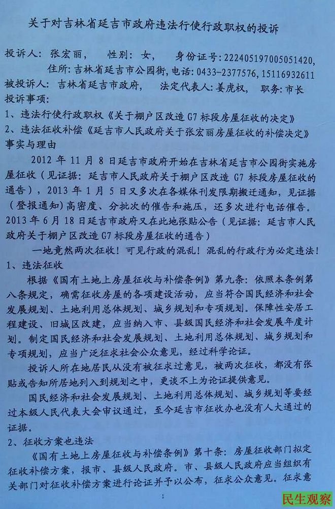 民生观察工作室2016/5/3消息:张宏丽是吉林省延吉市公园街居民,近日她向工作室投诉,公园街一带已有六百多户居民的房子被拆了,现在还有数十户居民拒绝搬迁,当地法院声称明天就来强拆她家的房子。