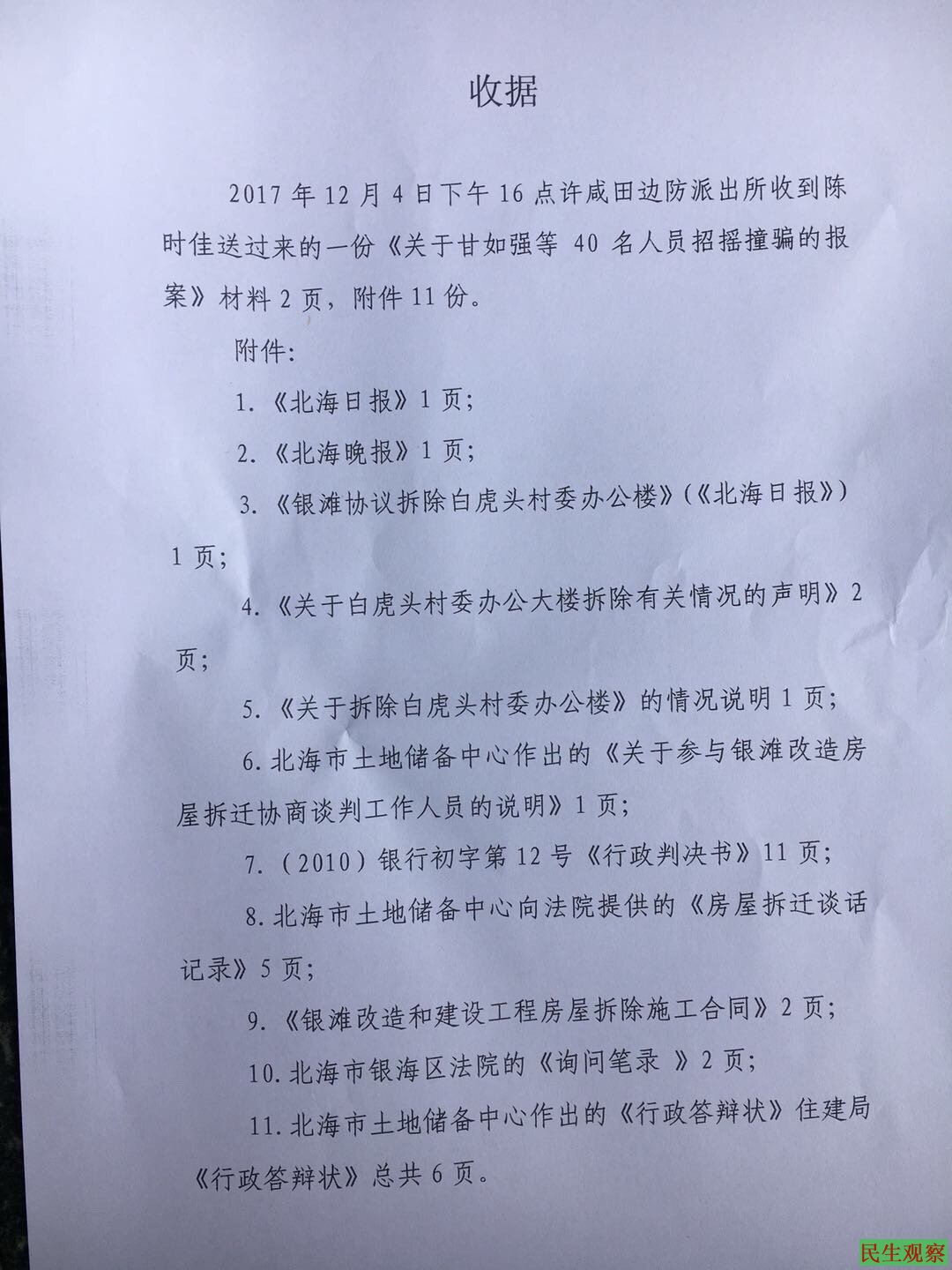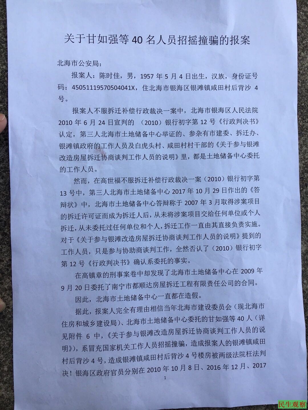 据悉,昨天陈时佳李冰凤夫妇曾到北海市公安局咸田边防派出所报案,举报书《关于甘如强等40名人员造谣撞骗的报案》中说,不服北海市银海区人民法院2010年6月24日宣判的(2010)银行初字第12号《行政判决书》的认定,第三人北海市土地储备中心举证的、掺杂有市建委、拆迁办、银滩镇政府的工作人员及白虎头村干部的《关于参与银滩改造房屋拆迁协商谈判工作人员的说明》里,都是土地储备中心委托的工作人员…系假冒冒充国家机关工作人员招摇撞骗,造成报案人的银滩镇咸田村背沙4号楼房被两级法院枉法判决。银海区政府官员分别在2010年10月8日至2016年12月、2017年1月15日,多次动用大批政府联防队员破坏门窗,公安警力欲意进行违法强拆无果,现在使用黑社会手段非法在家门口安装监控摄像头,致使一家人从2010年至今没有过上一天安生日子,不但承受了巨大的精神压力,并且经济损失惨重。为了维护报案人合法财产神圣不可侵犯,希望北海市公安局立案查处,依法将犯罪分子缉拿归案。