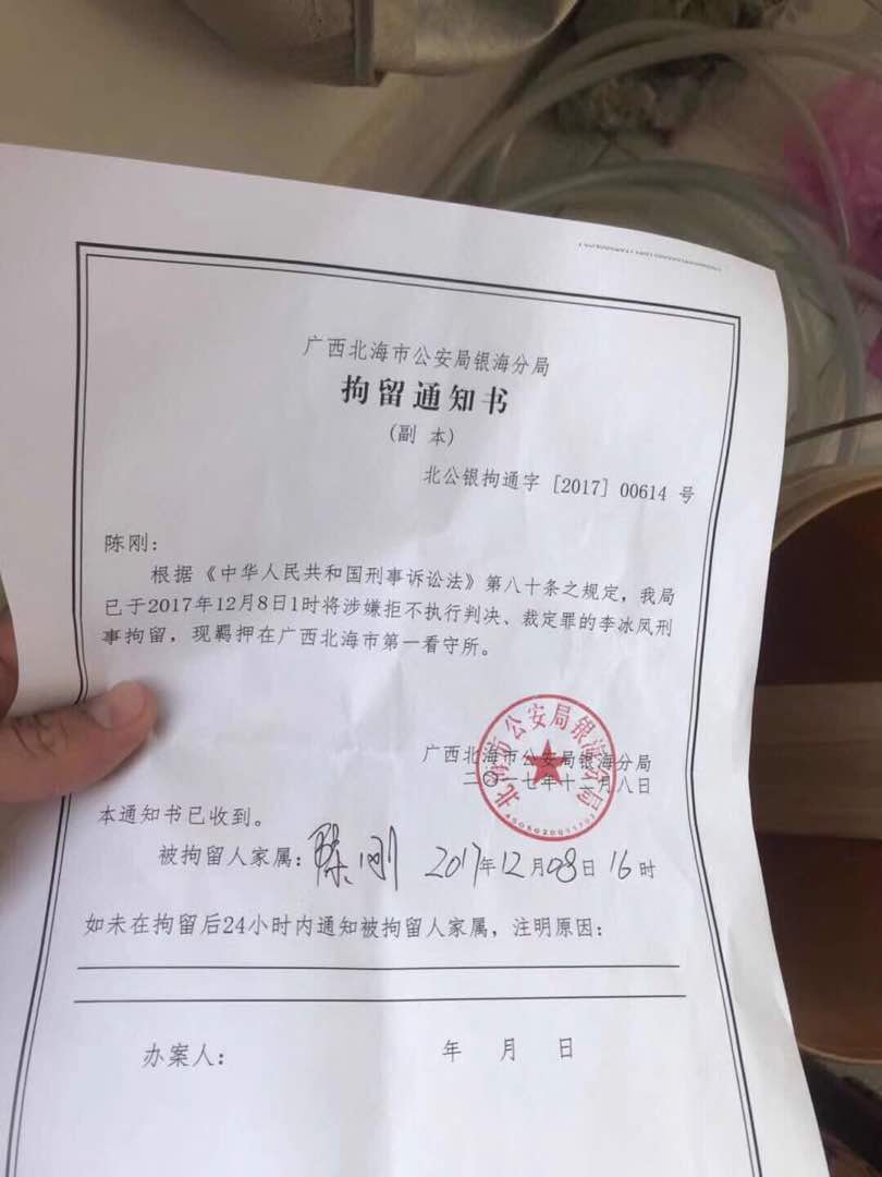 正当村民上网寻找陈时佳、李冰凤夫妇时,在自家楼顶坚守了一夜一天的陈刚今天下午将近五点钟收到了来自“广西北海市公安局银海分局”对他父母的《刑拘通知书》。通知书上称:“根据《中华人民共和国刑事诉讼法》第八十条之规定,我局已于2017年12月8日1时将涉嫌拒不执行判决、裁定罪的陈时佳刑事拘留,现羁押在广西北海市第二看守所。”而陈时佳的妻子李冰凤则以同样的罪名被关押在广西北海市第一看守所。