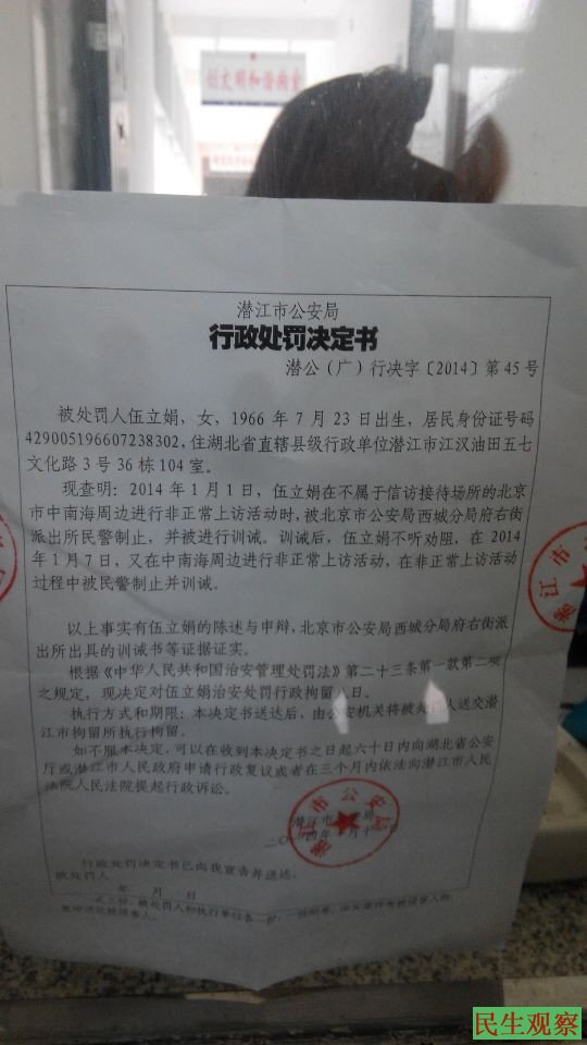 就这样伍立娟在北京白天就不停的去各个部门上访,晚上就去中南海找最高领导人送马家楼。在这期间潜江市信访局长袁用兵多次打电话让伍立娟回当地,伍立娟知道局长是个骗子说话从不守信,伍立娟接到电话就直接叫骗子局长,骗子局长叫伍立娟回来说要给伍立娟解决问题,还说要给伍一个大惊喜,就这样伍在元月7号再次去了中南海送马家楼被驻京办张志成接访到潜江市驻京办软禁了三天,银行保卫与保安两个人在守候,还有潜江市杨寺派出所所长汤良荣与欧阳德龙在驻京办,伍立娟所在住处辖区应该是江汉油田五七派出所,或者是油田广华派出所,也不应该是潜江市杨寺派出所所管辖,在驻京办谈的很好要我回来好好过春节,有困难回来会解决,就这样伍被骗子局长袁用兵欺骗回来了。