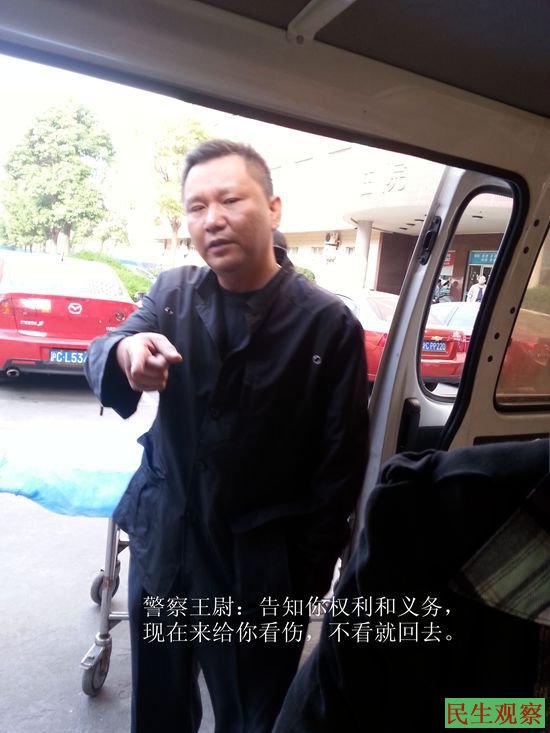 10月17日早晨5点刚过,我准备外出,被在楼道口守候已久的马桥镇派出所未穿警服的警察王尉、马桥镇信访办工作人员张漪等七八人拦截不让外出,被我拒绝,他们这伙人一涌而上拳打脚踢,暴力将我硬按进汽车,他们几个人使劲摁住我的手脚,还有一个掐住我的头颈,整个人被扑倒架空在汽车椅子边上不能动弹,把我肋骨打成骨折,司法鉴定为轻微伤。