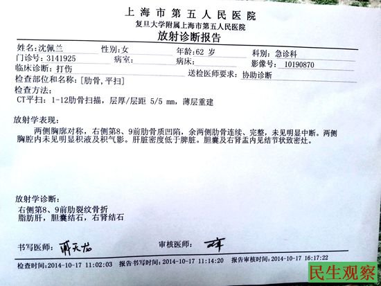 2014年10月17日,我遭上海闵行区马桥镇派出所警察王尉、马桥镇信访办工作人员张漪等七八人绑架、殴打,导致第八、九两根肋骨骨折。
